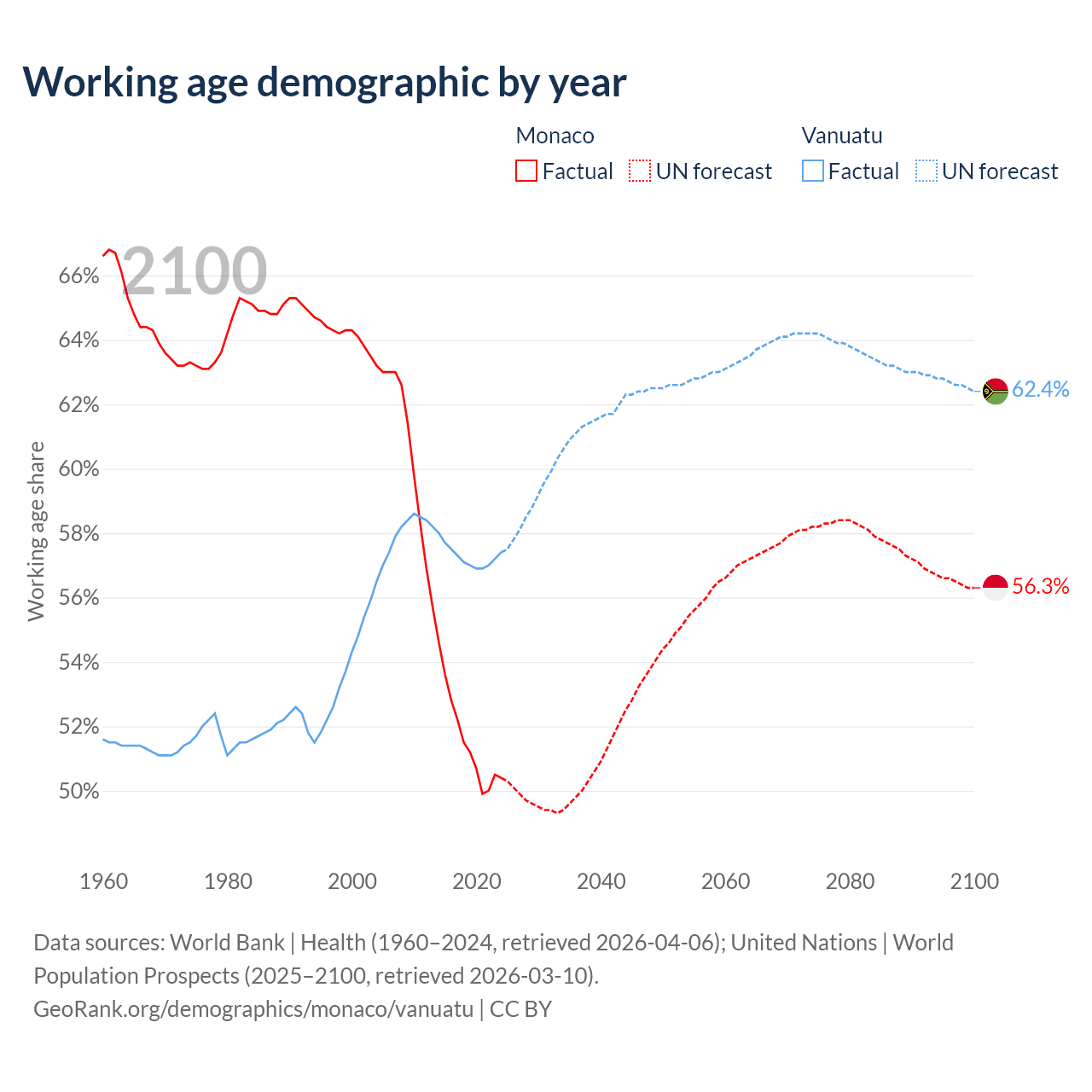 Median age Monaco vs Vanuatu, 1960-2100