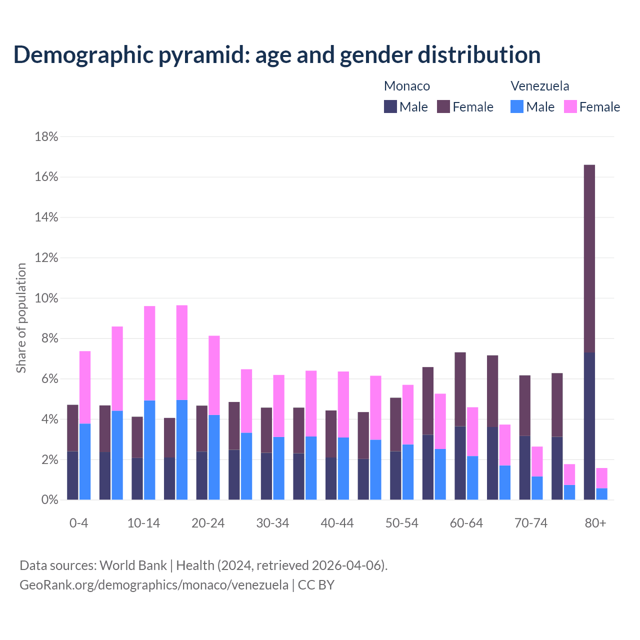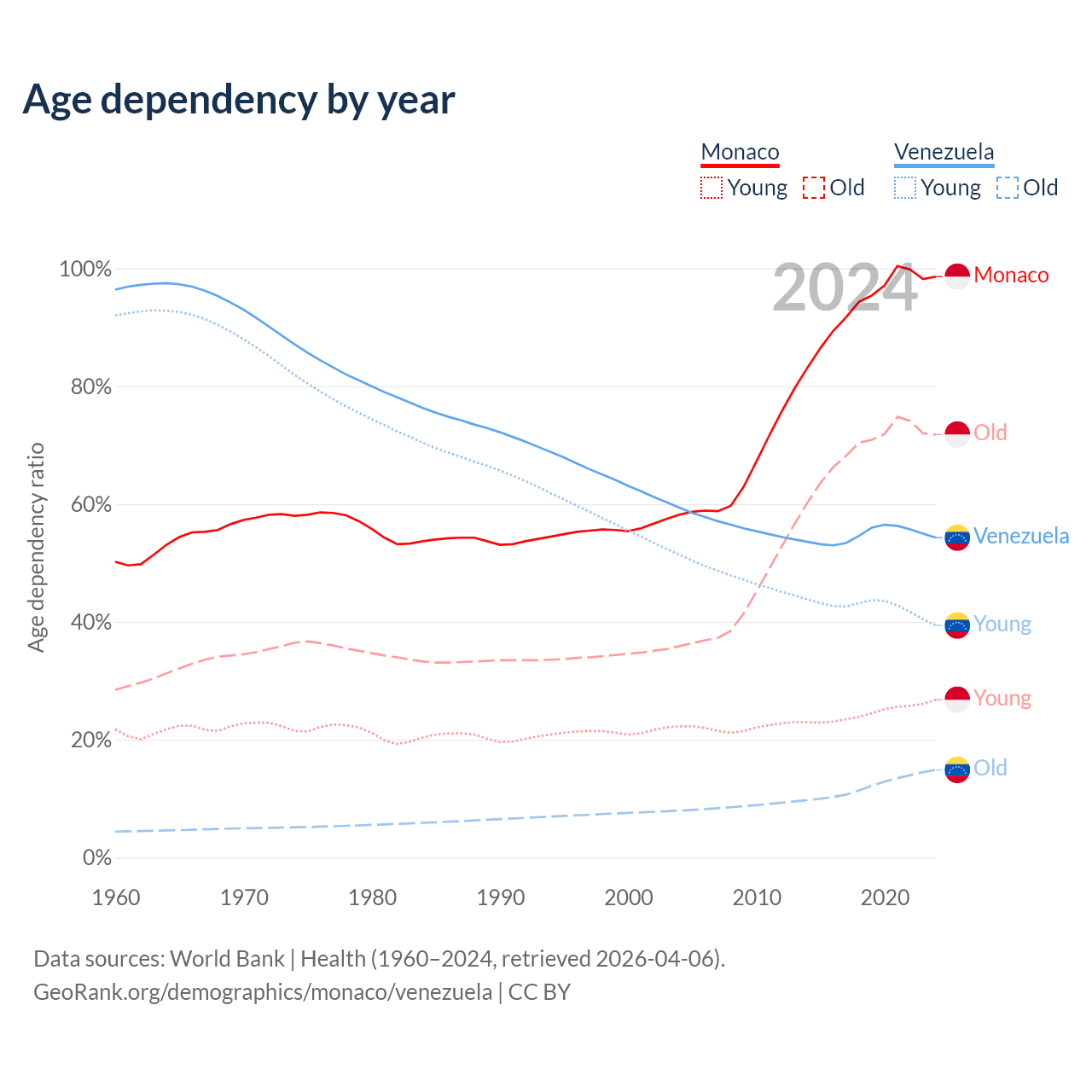 - Monaco is ranked 1/196 by median age (oldest to youngest) vs 104/196 for Venezuela.
