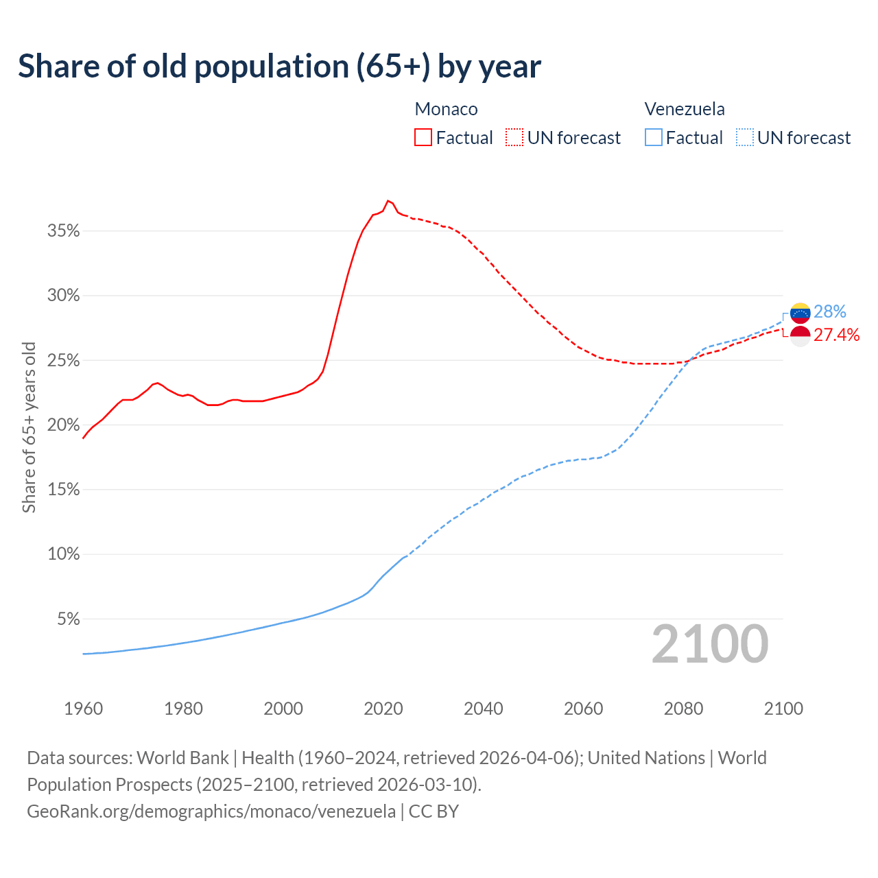 - The share of old-age demographic (65+) in Monaco is 36.2% vs 9.68% in Venezuela.