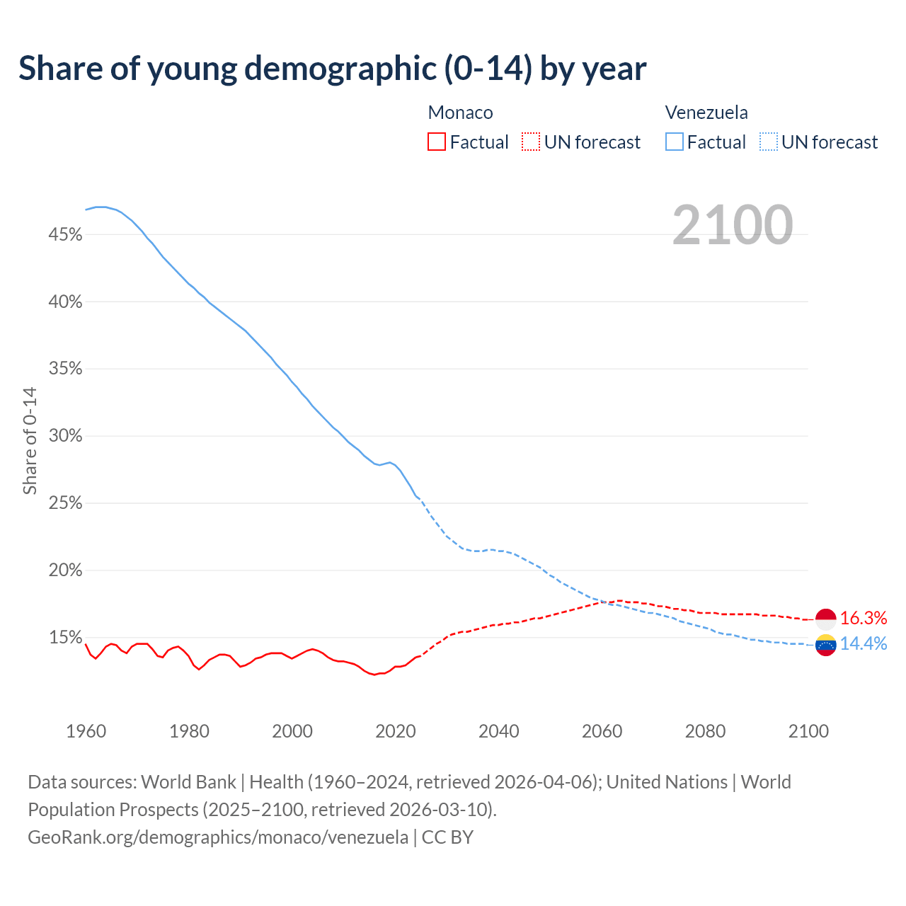 - The share of young demographic (0-15 years old) in Monaco is 13.5% vs 25.5% in Venezuela.