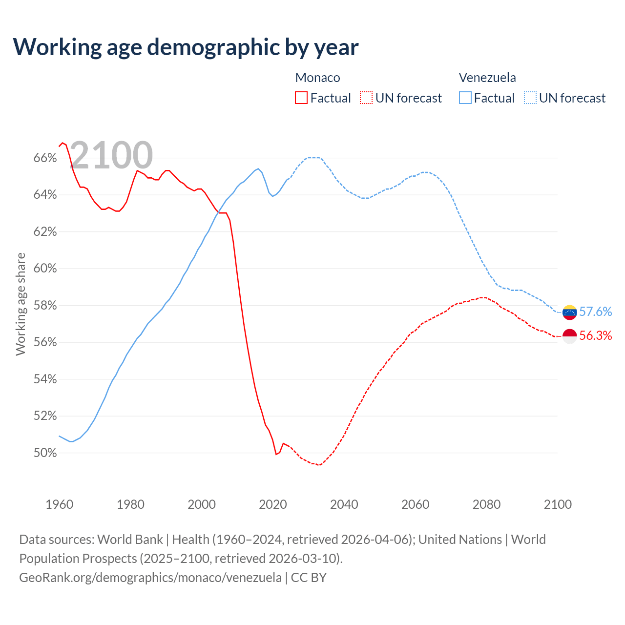 - Monaco has 19.2K working age adults (aged 15-64) vs 18.6M in Venezuela.