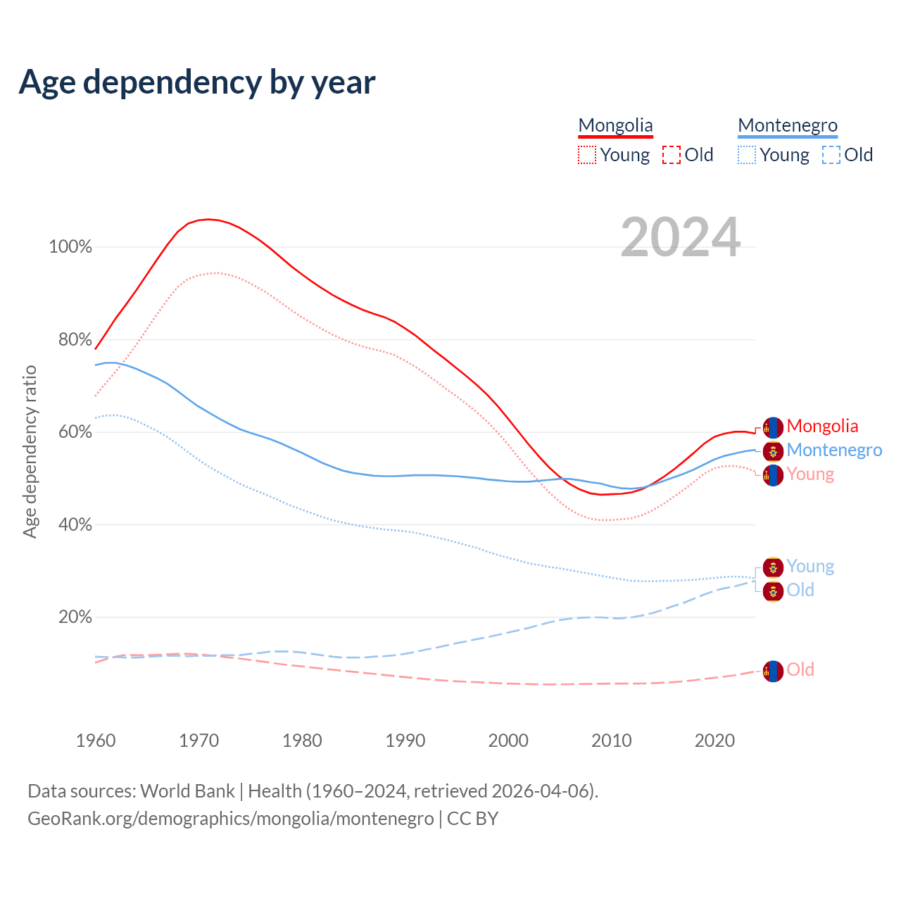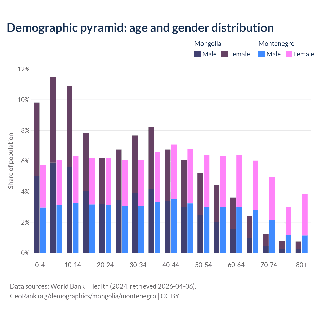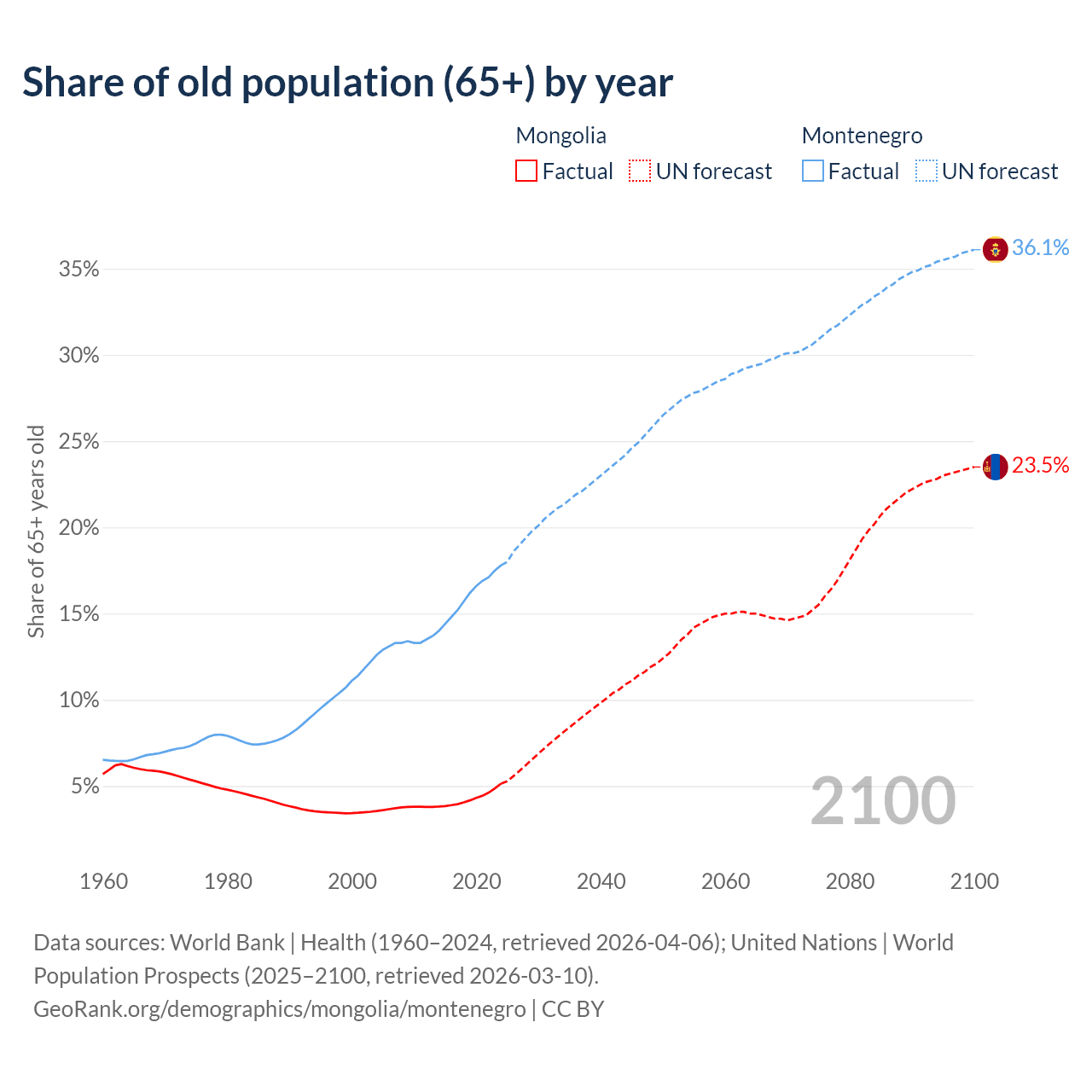 The share of older people aged 65 and over is 5.14% in Mongolia and 17.8% in Montenegro. Life expectancy in Mongolia compared to Montenegro .