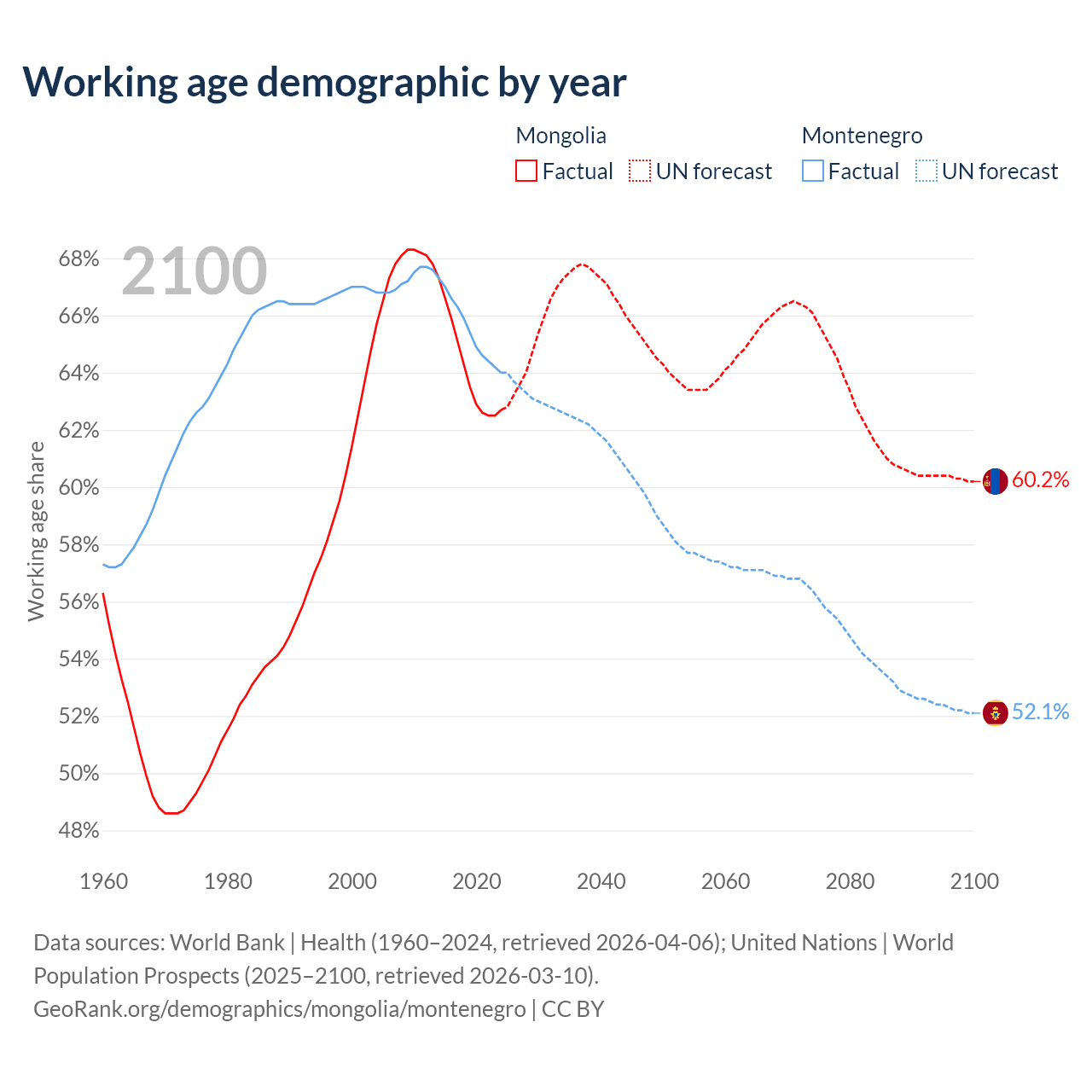 Median age Mongolia vs Montenegro, 1960-2100