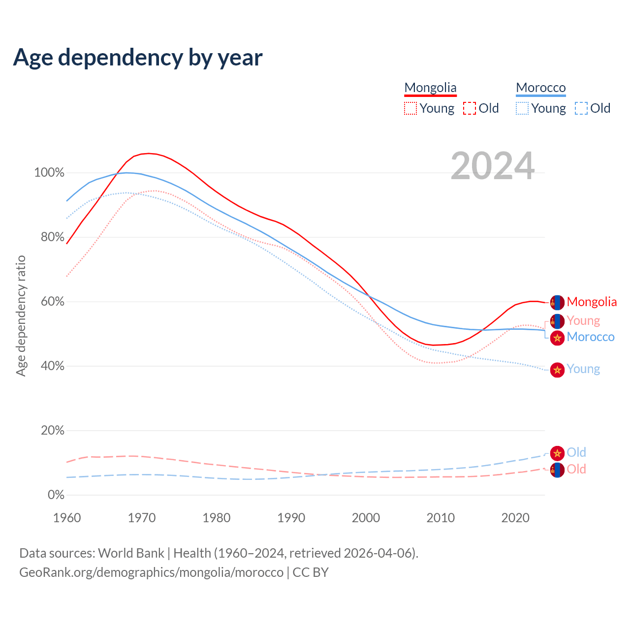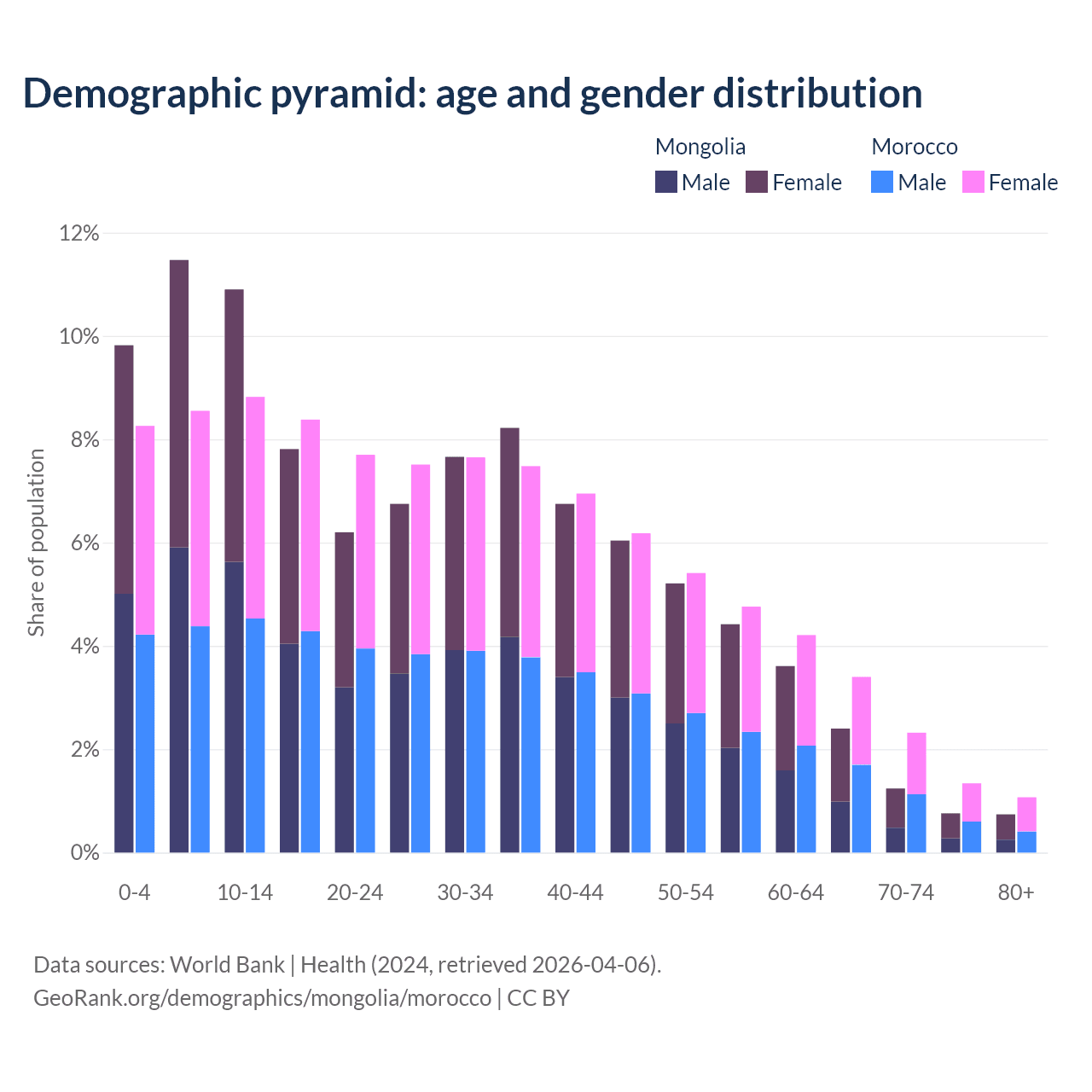 - Mongolia is ranked 117/196 by median age (oldest to youngest) vs 100/196 for Morocco.