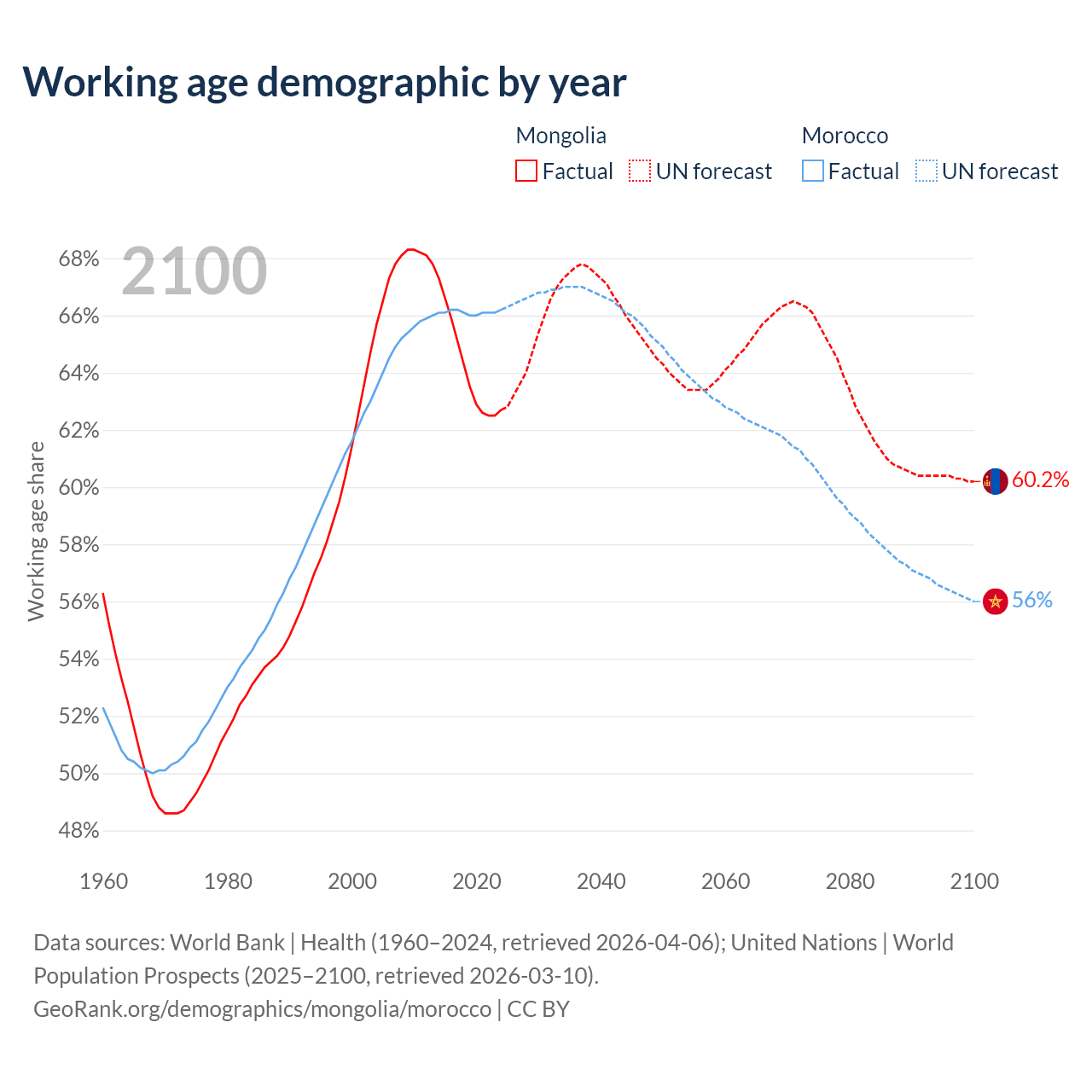 - As of 2026, the population of Mongolia is 3.62M vs 38.9M in Morocco - 10.7 times difference.