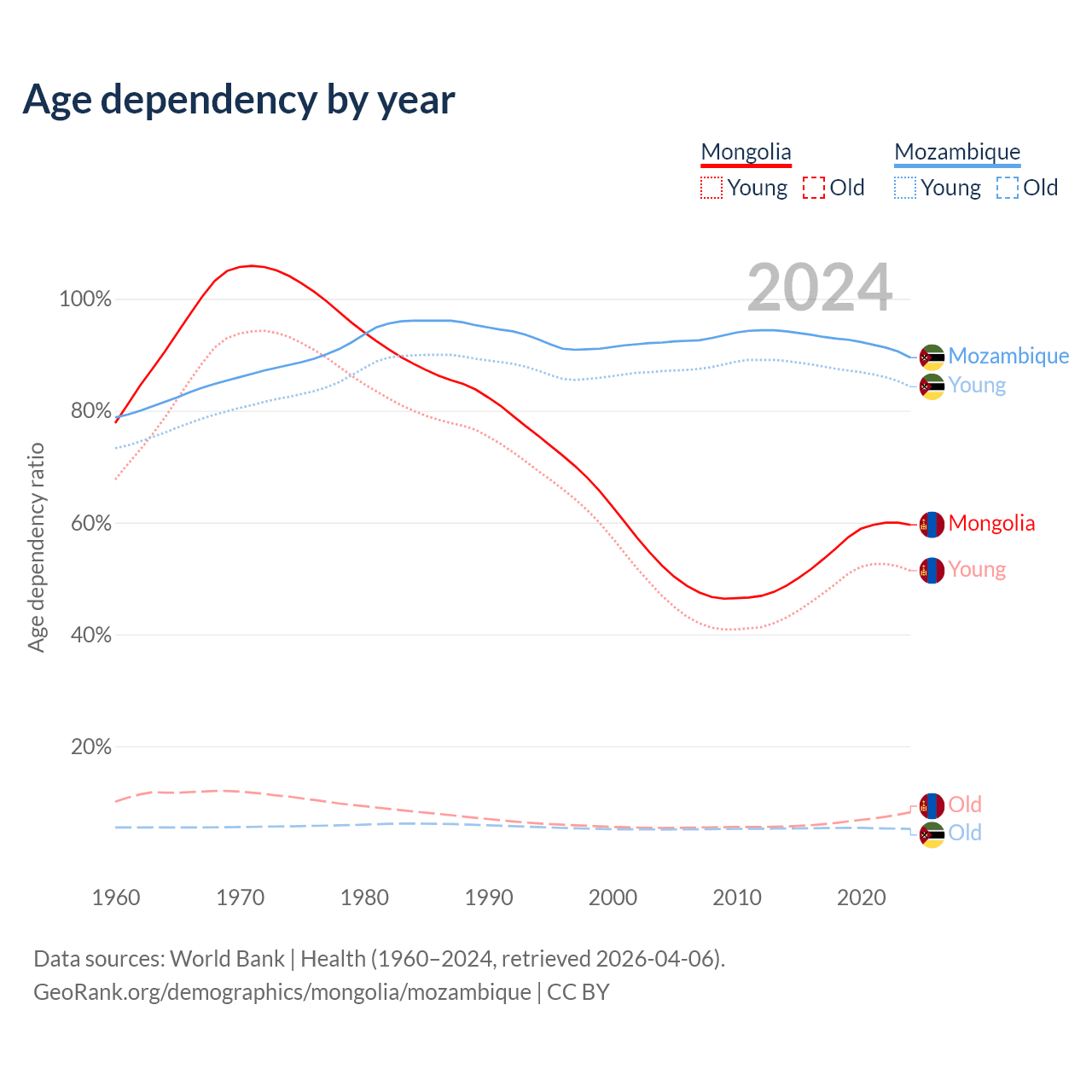 - Mongolia is ranked 117/196 by median age (oldest to youngest) vs 189/196 for Mozambique.