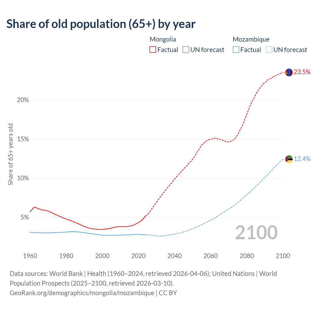 - The share of old-age demographic (65+) in Mongolia is 5.14% vs 2.75% in Mozambique.