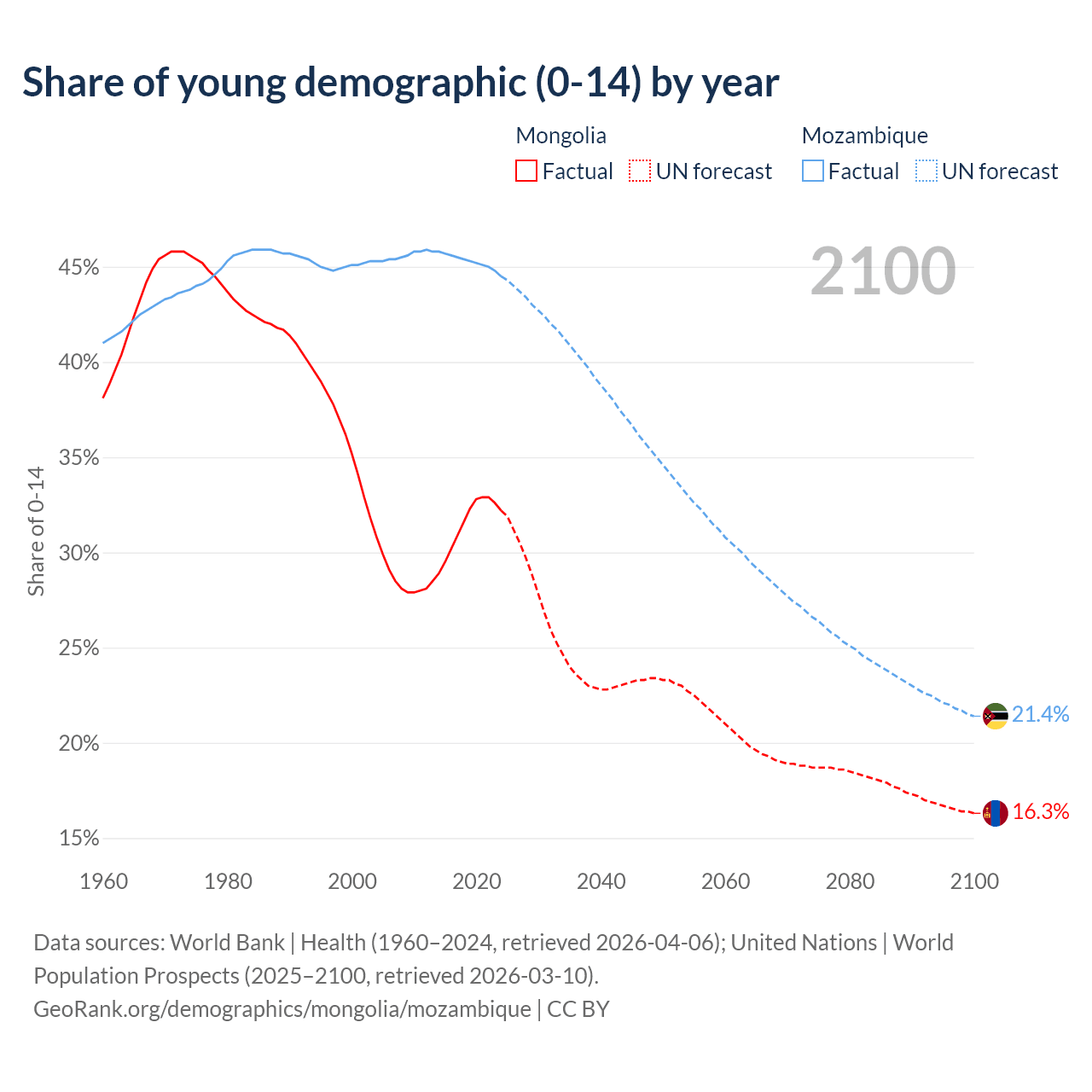 - The share of young demographic (0-15 years old) in Mongolia is 32.2% vs 44.5% in Mozambique.