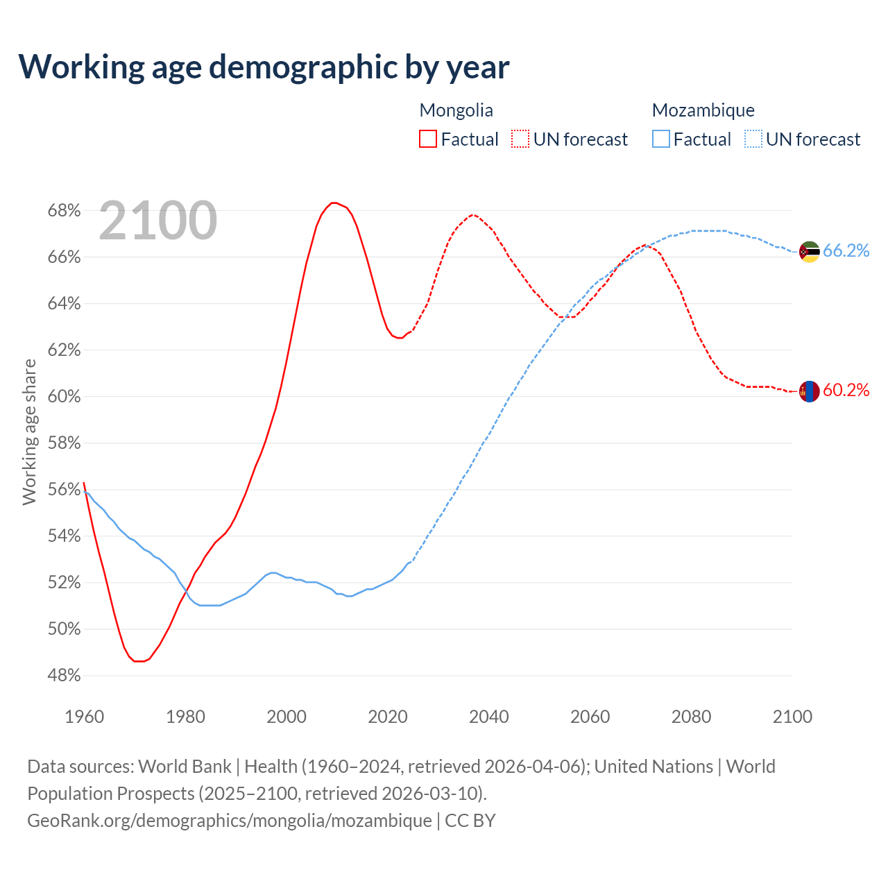 - Mongolia has 2.27M working age adults (aged 15-64) vs 19.5M in Mozambique.