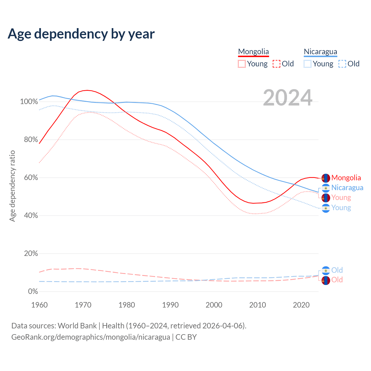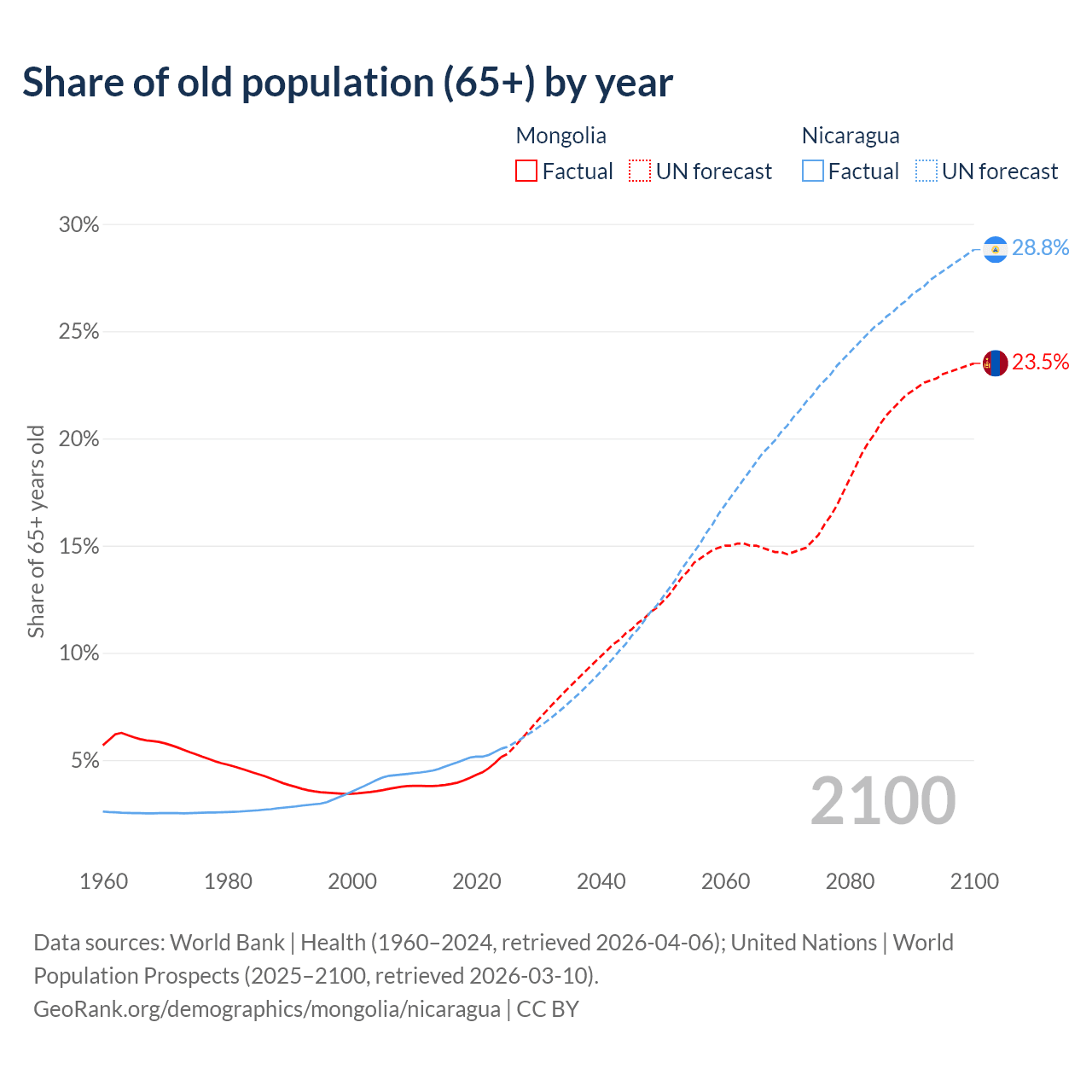 - The share of old-age demographic (65+) in Mongolia is 5.14% vs 5.53% in Nicaragua.