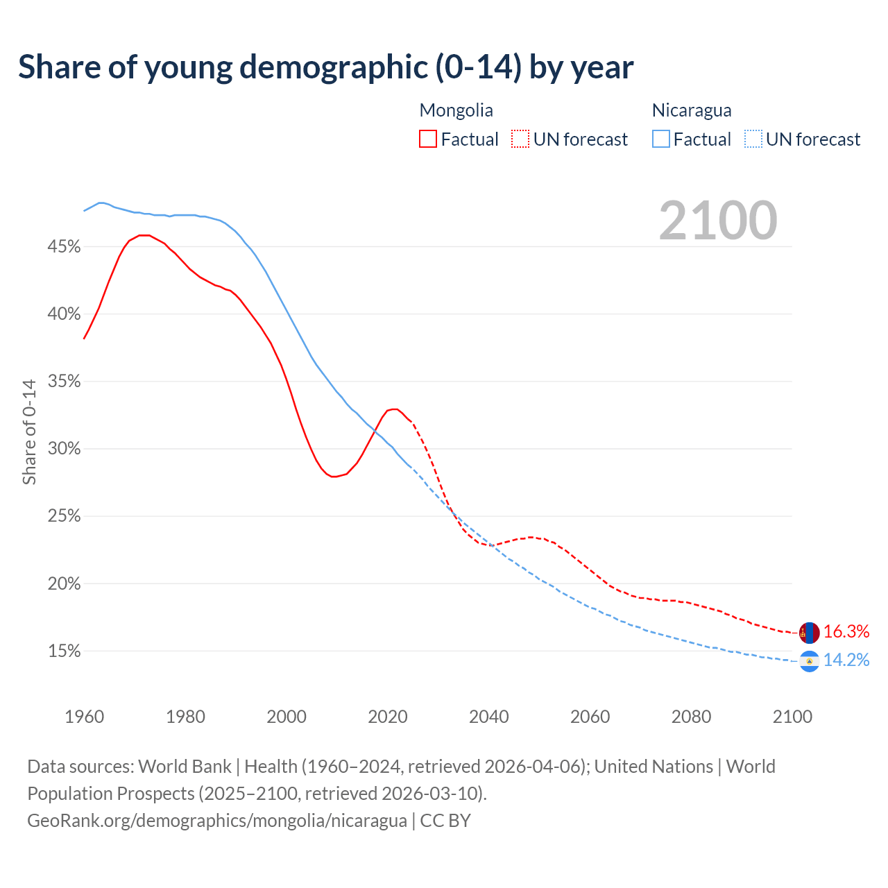 - The share of young demographic (0-15 years old) in Mongolia is 32.2% vs 28.8% in Nicaragua.