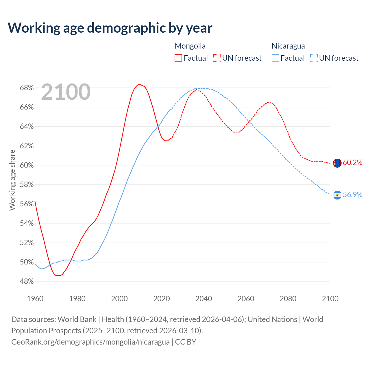 Median age Mongolia vs Nicaragua, 1960-2100