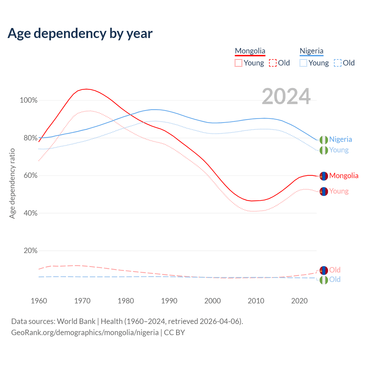 - The share of old-age demographic (65+) in Mongolia is 5.14% vs 3.05% in Nigeria.