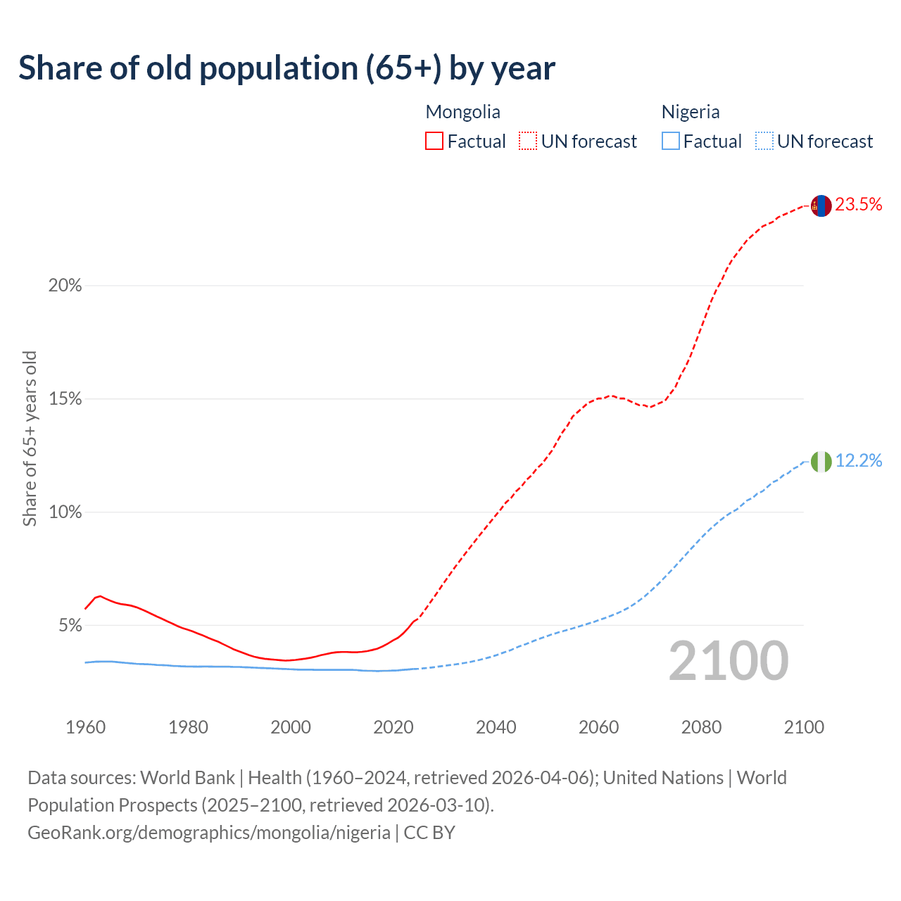 The share of older people aged 65 and over is 5.14% in Mongolia and 3.05% in Nigeria. Life expectancy in Mongolia compared to Nigeria .
