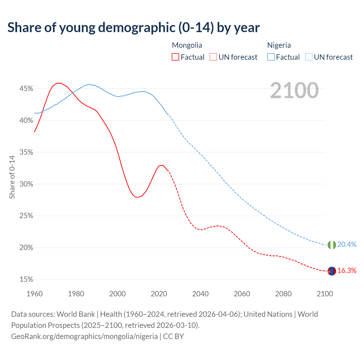 - The share of young demographic (0-15 years old) in Mongolia is 32.2% vs 41% in Nigeria.