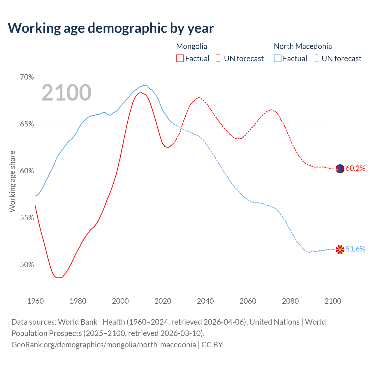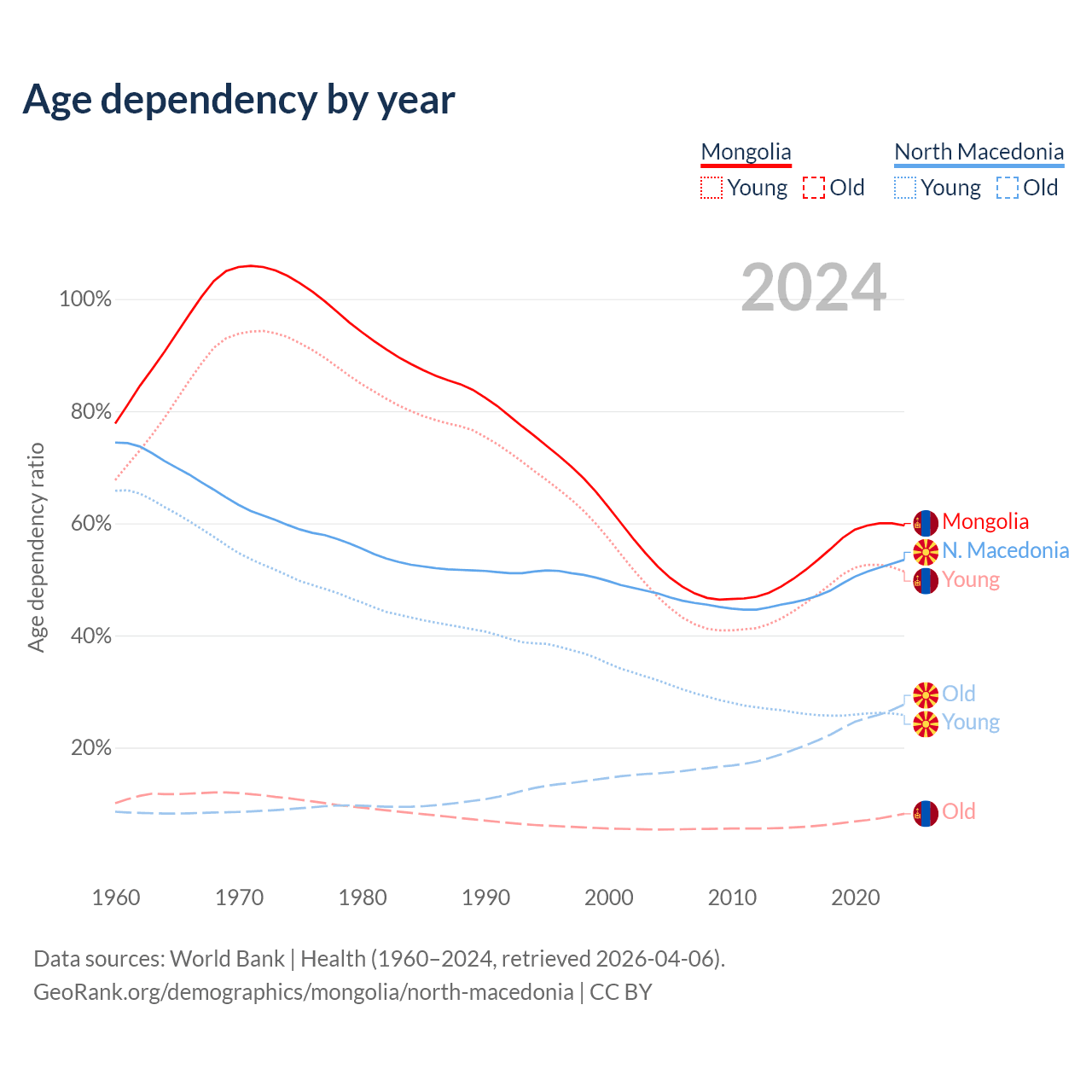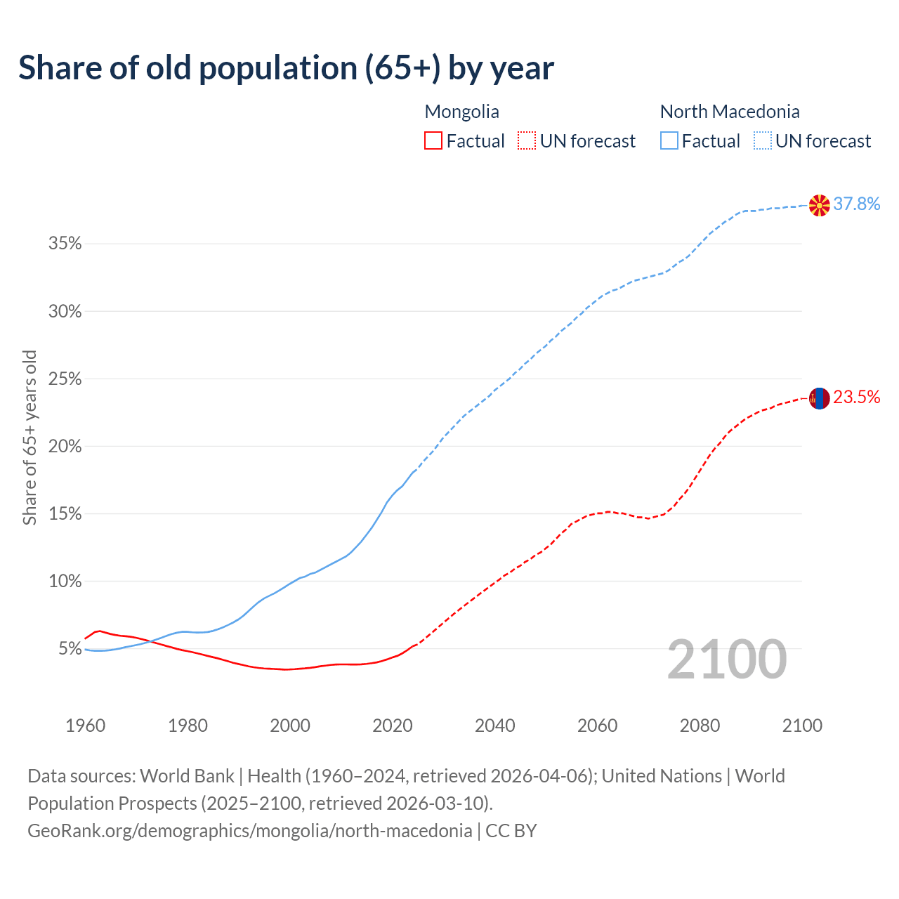 The share of older people aged 65 and over is 5.14% in Mongolia and 18% in North Macedonia. Life expectancy in Mongolia compared to North Macedonia .