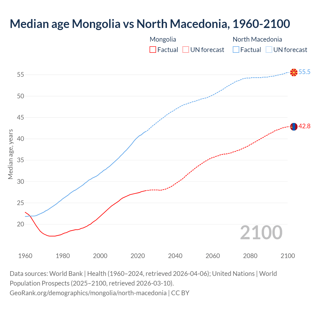 Median age Mongolia vs North Macedonia, 1960-2100