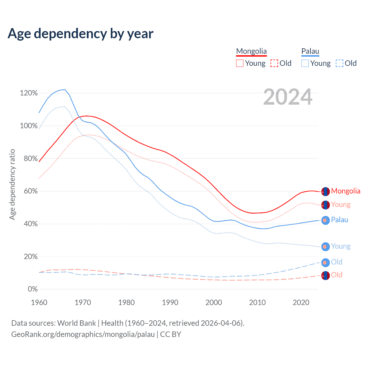 - The share of old-age demographic (65+) in Mongolia is 5.14% vs 11.3% in Palau.