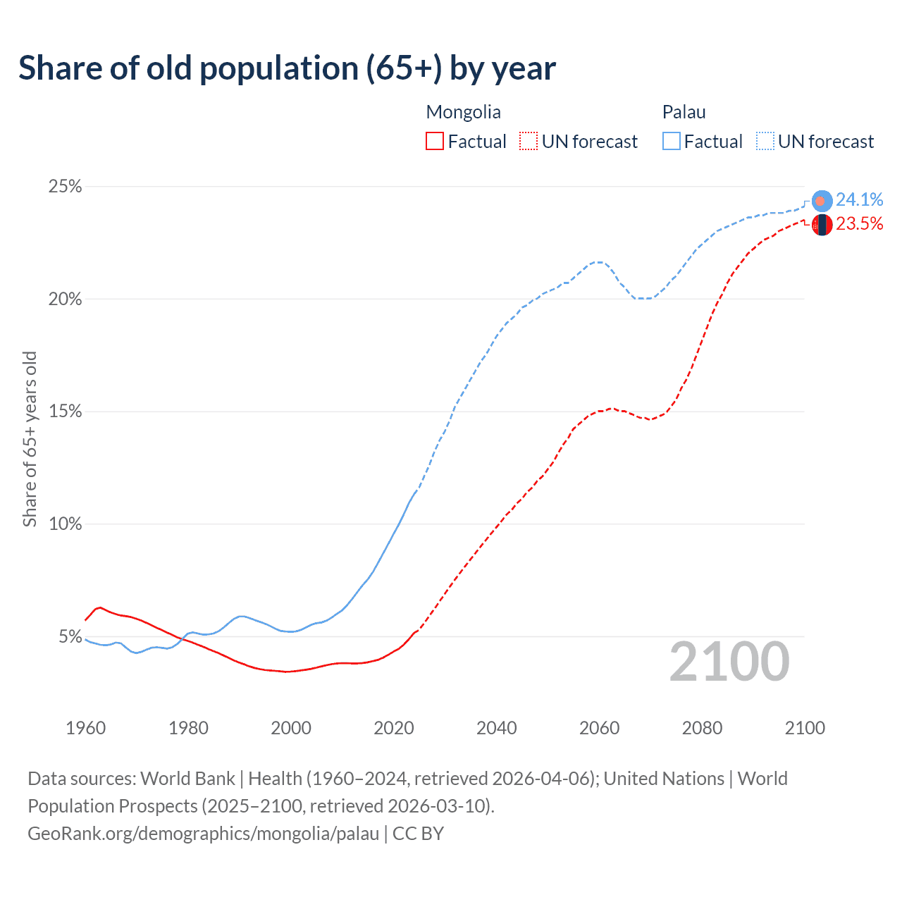 The share of older people aged 65 and over is 5.14% in Mongolia and 11.3% in Palau. Life expectancy in Mongolia compared to Palau .