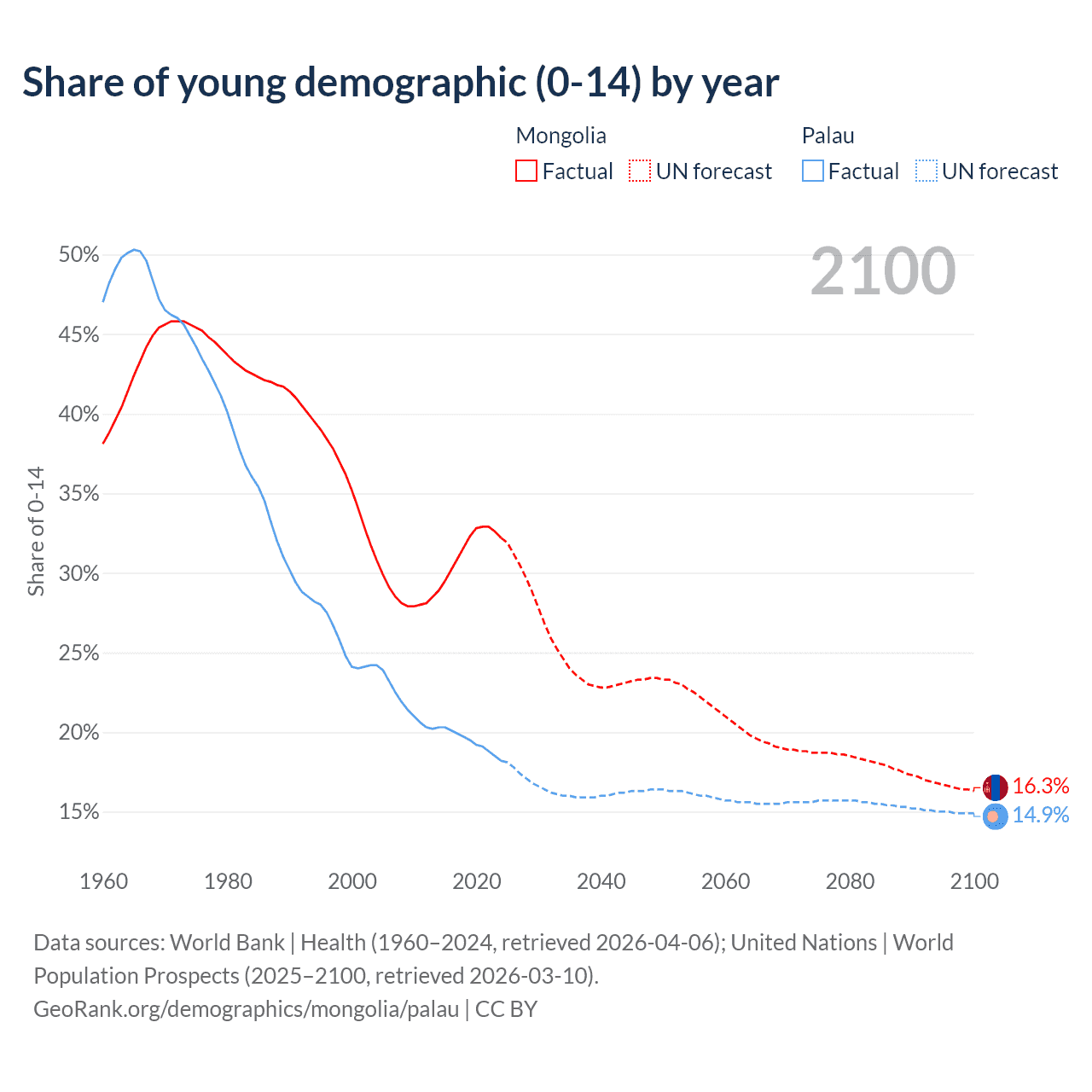 - The share of young demographic (0-15 years old) in Mongolia is 32.2% vs 18.2% in Palau.