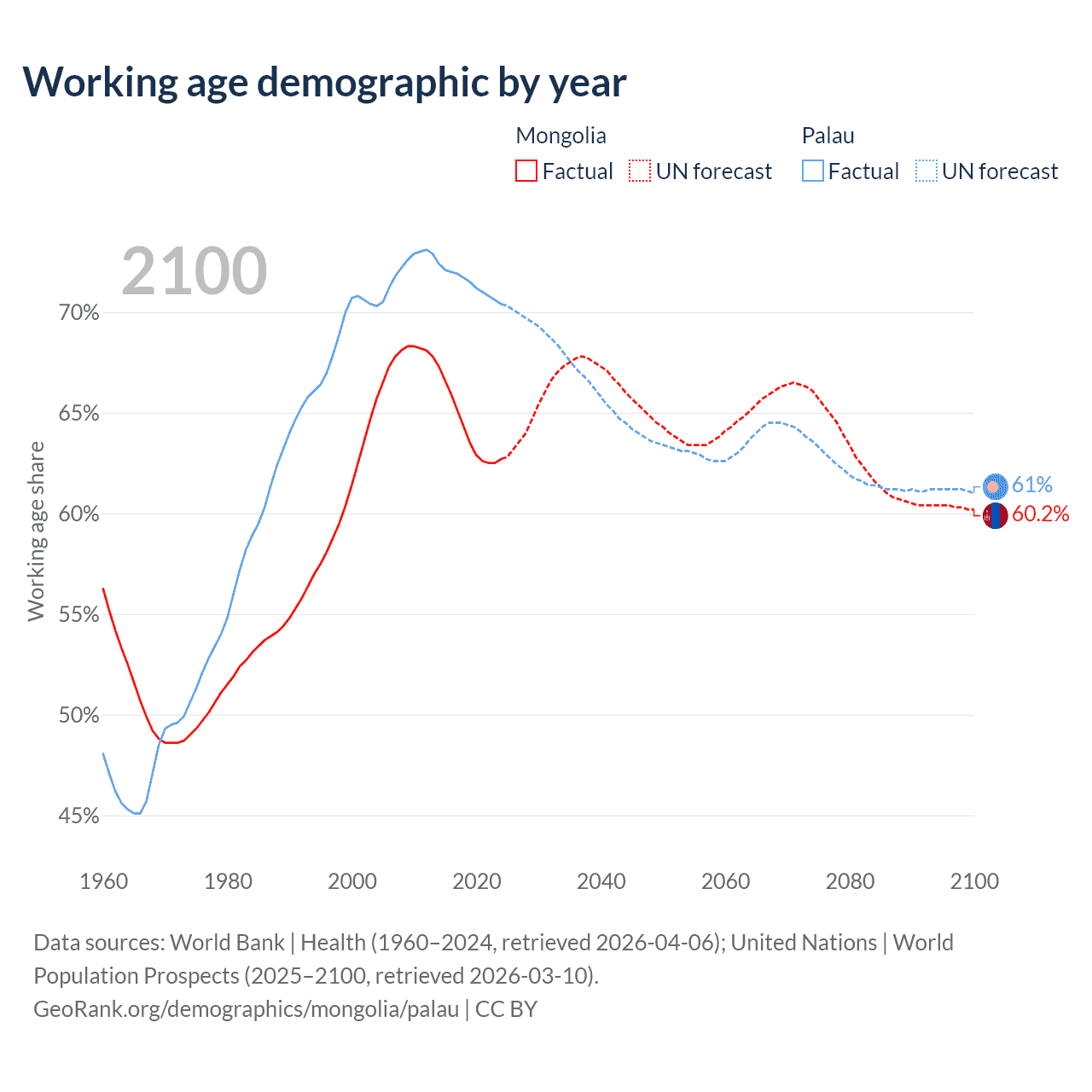 - Mongolia has 2.27M working age adults (aged 15-64) vs 12.4K in Palau.