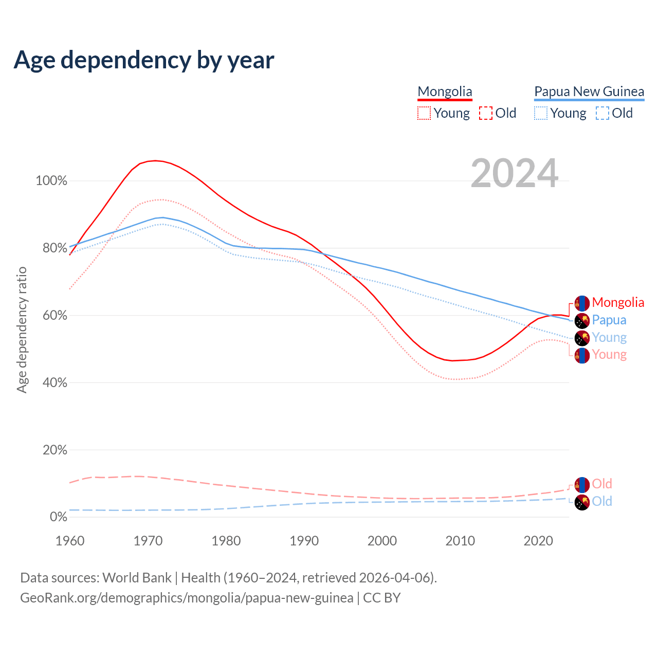 - Mongolia is ranked 117/196 by median age (oldest to youngest) vs 140/196 for Papua New Guinea.
