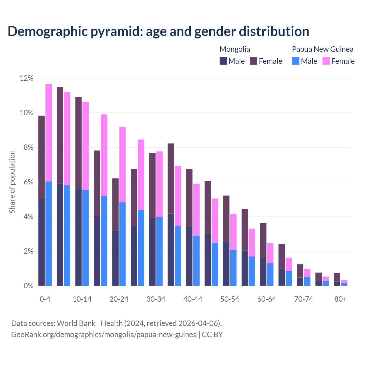 - As of 2026, the population of Mongolia is 3.62M vs 11M in Papua New Guinea - 3.04 times difference.