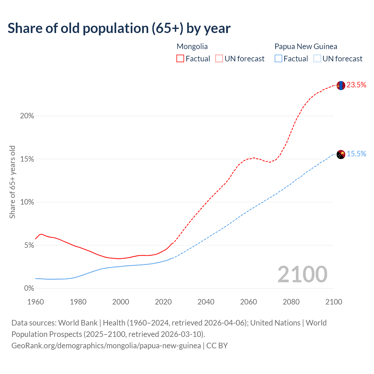 The share of older people aged 65 and over is 5.14% in Mongolia and 3.46% in Papua New Guinea. Life expectancy in Mongolia compared to Papua New Guinea .