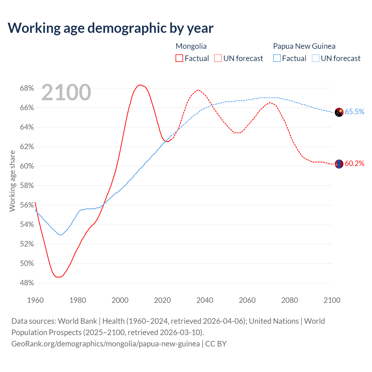 - Mongolia has 2.27M working age adults (aged 15-64) vs 6.94M in Papua New Guinea.
