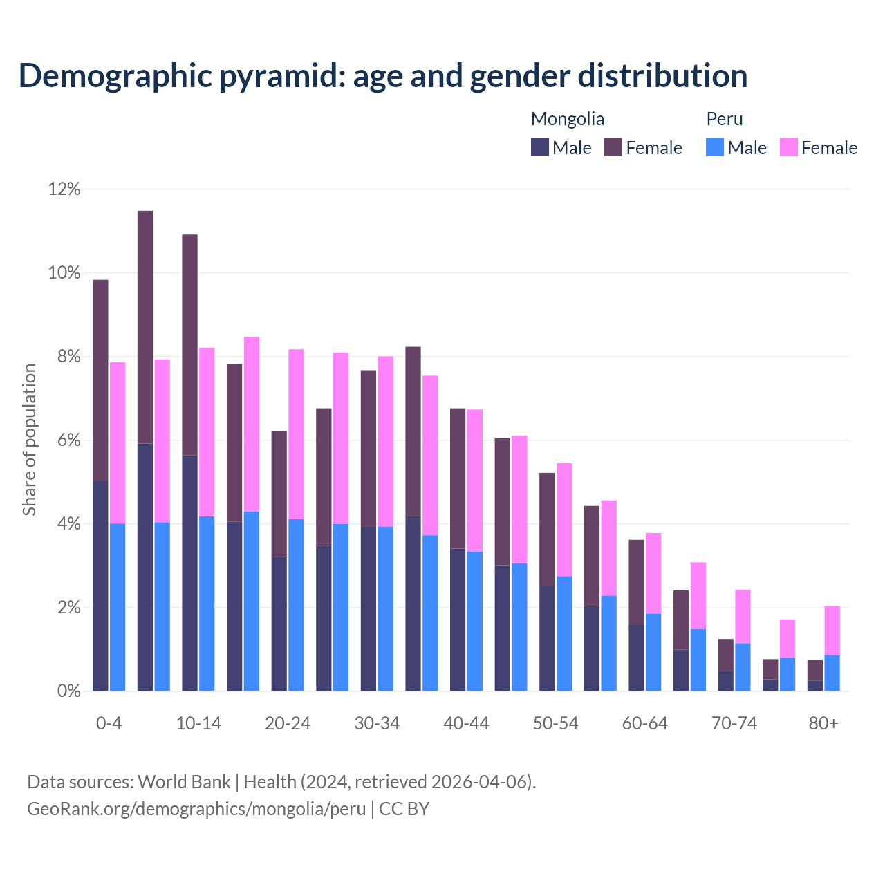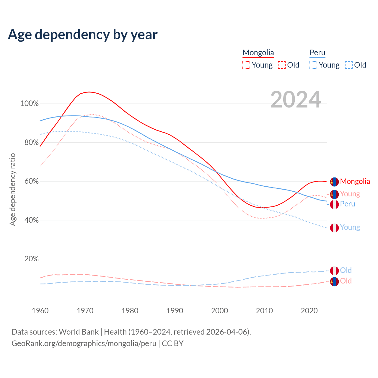 - Mongolia is ranked 117/196 by median age (oldest to youngest) vs 97/196 for Peru.