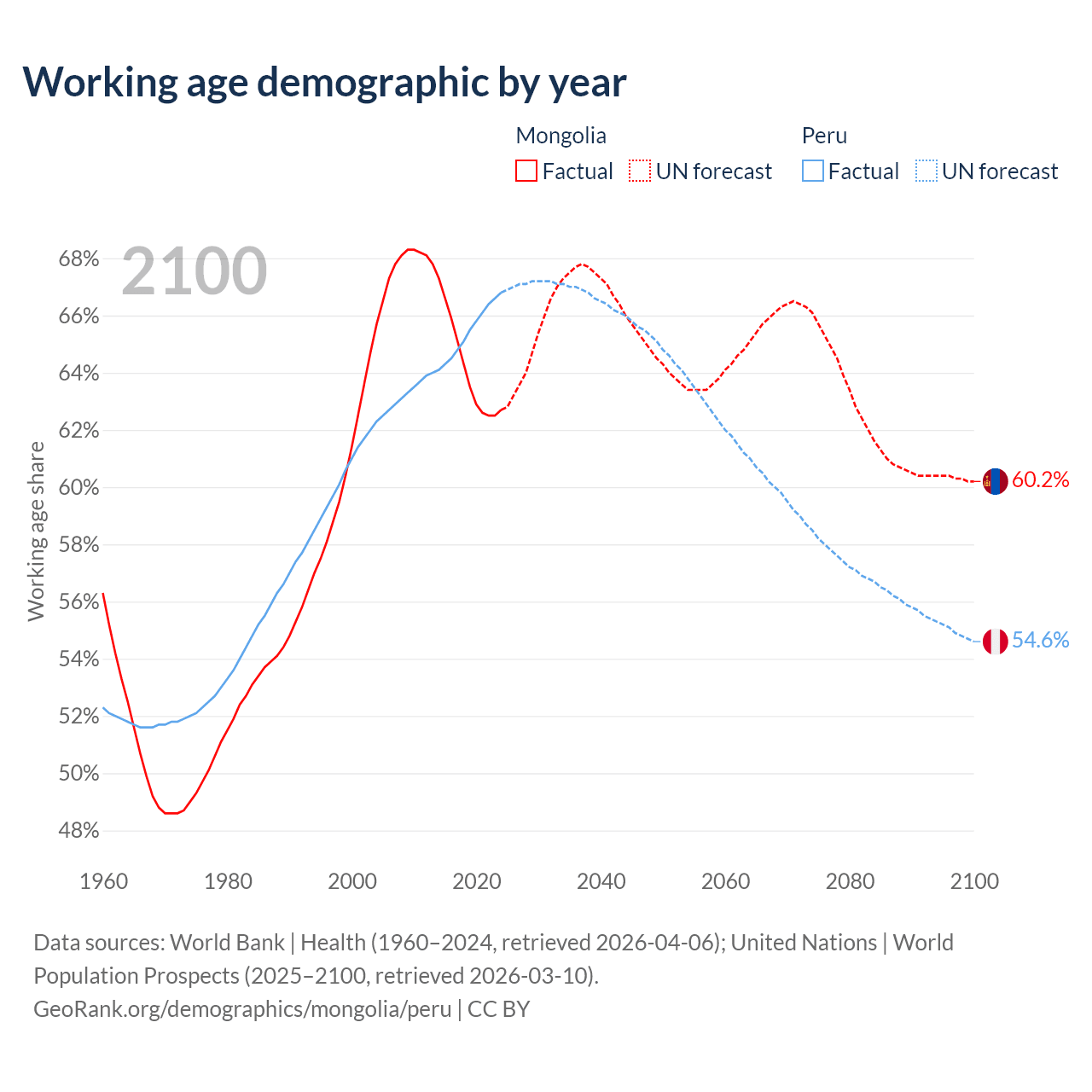 Median age Mongolia vs Peru, 1960-2100