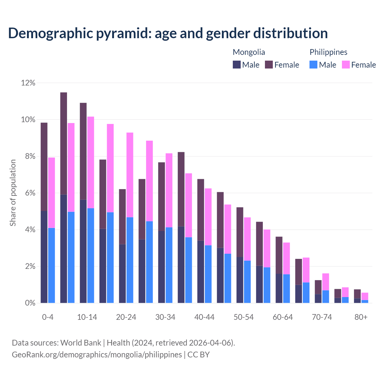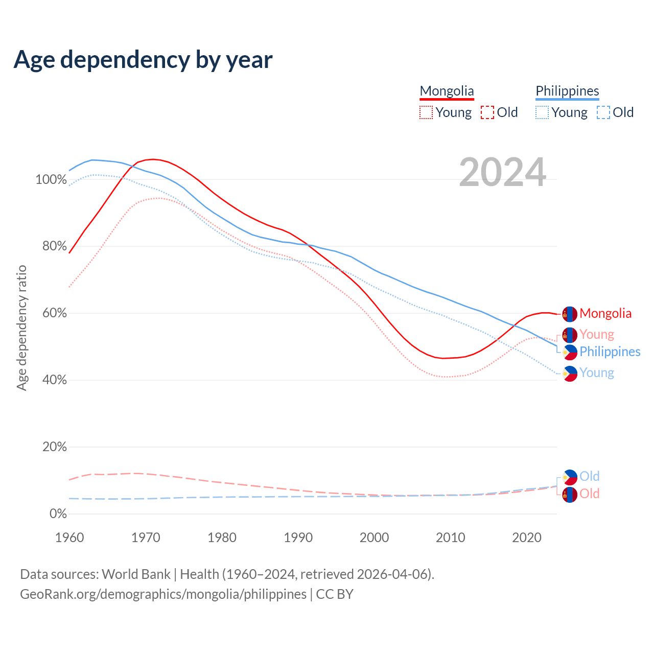- Mongolia is ranked 117/196 by median age (oldest to youngest) vs 123/196 for the Philippines.