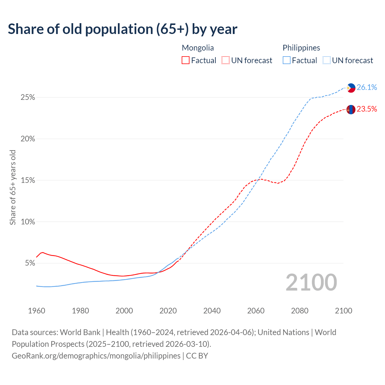 - The share of old-age demographic (65+) in Mongolia is 5.14% vs 5.49% in the Philippines.