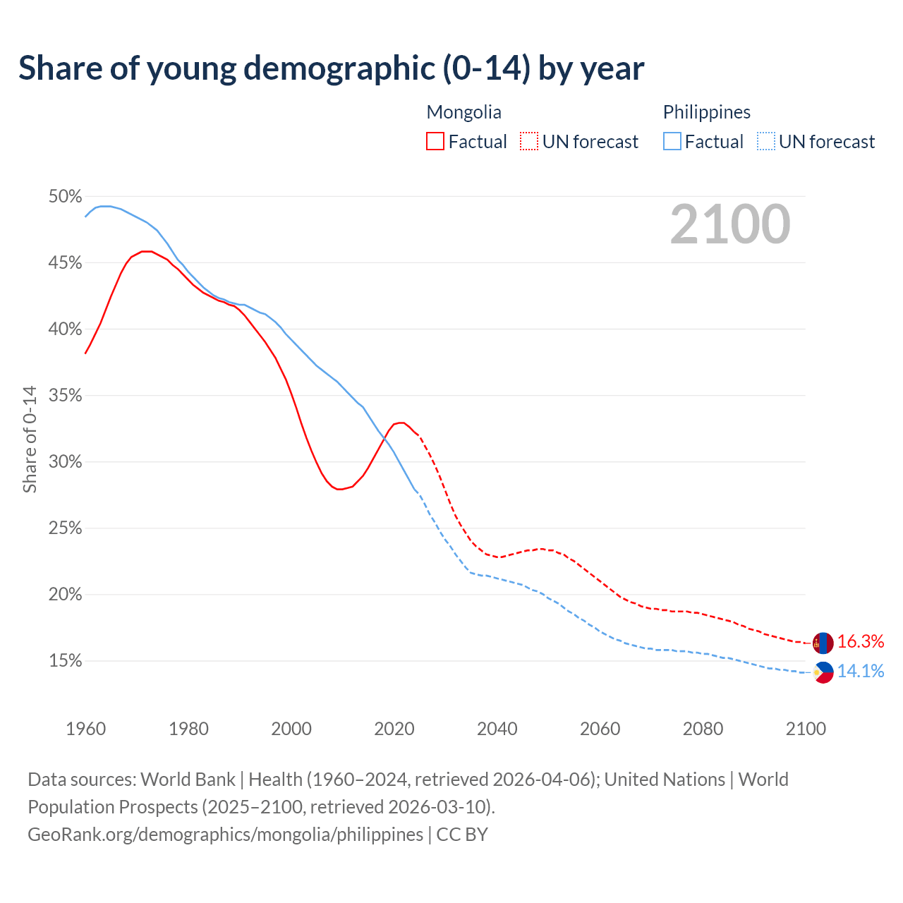 - The share of young demographic (0-15 years old) in Mongolia is 32.2% vs 27.9% in the Philippines.