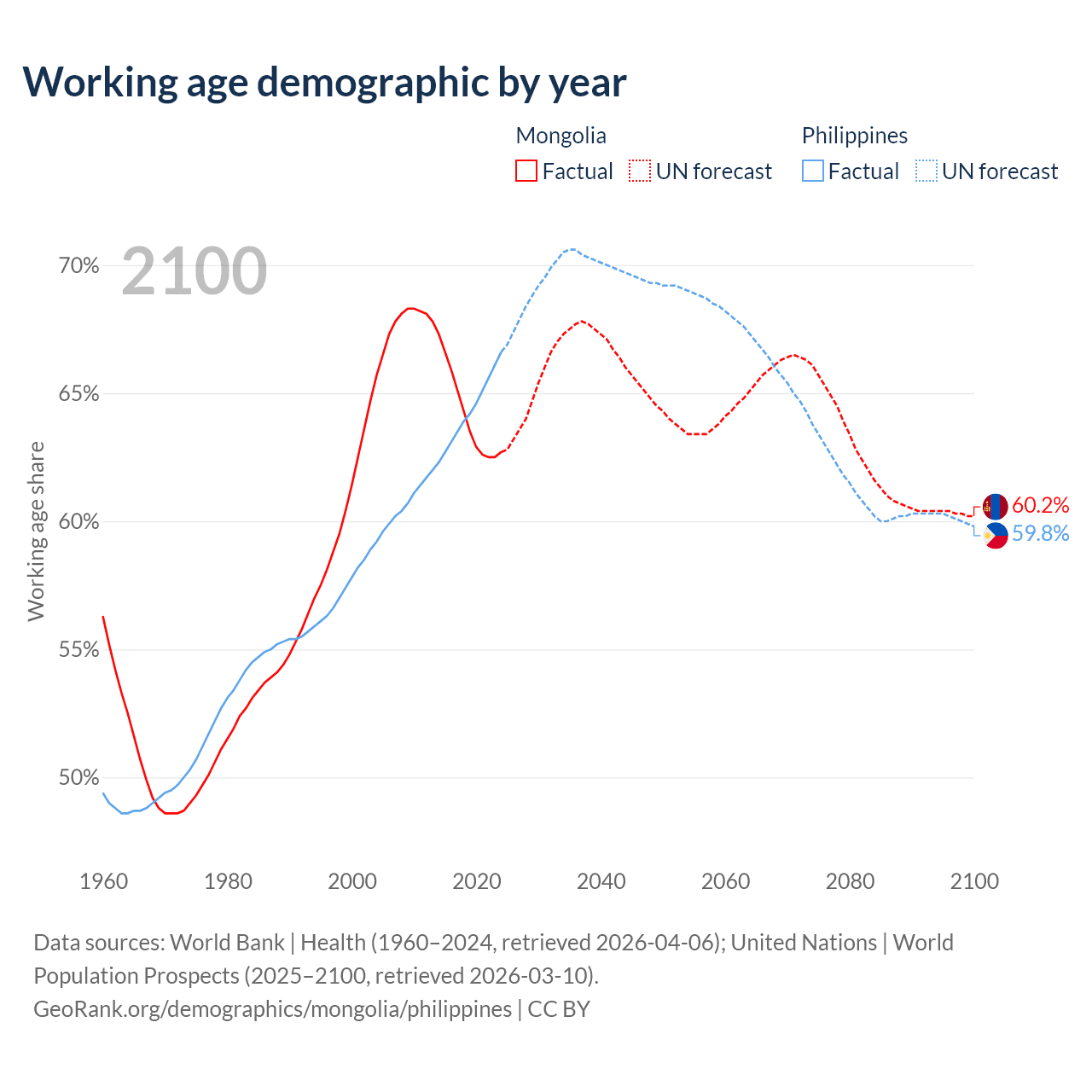 - Mongolia has 2.27M working age adults (aged 15-64) vs 78.6M in the Philippines.