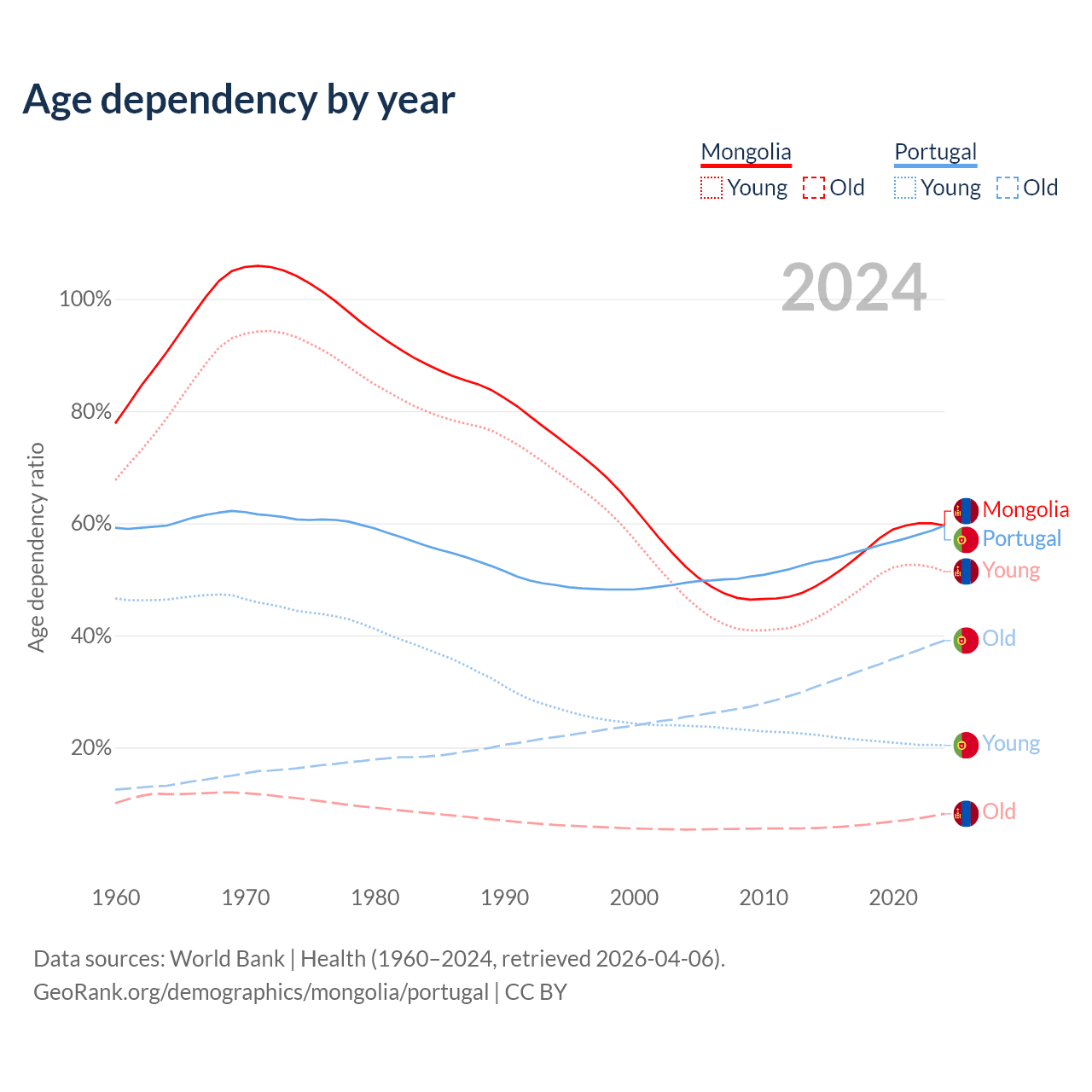 - Mongolia is ranked 117/196 by median age (oldest to youngest) vs 5/196 for Portugal.