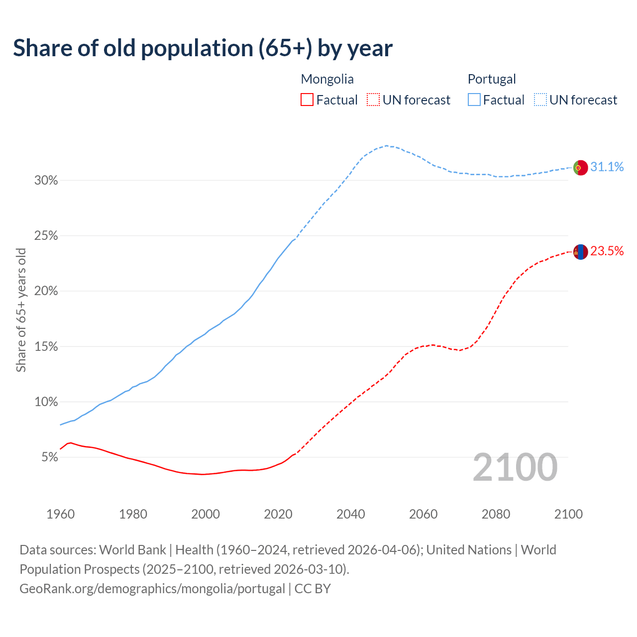 The share of older people aged 65 and over is 5.14% in Mongolia and 24.5% in Portugal. Life expectancy in Mongolia compared to Portugal .
