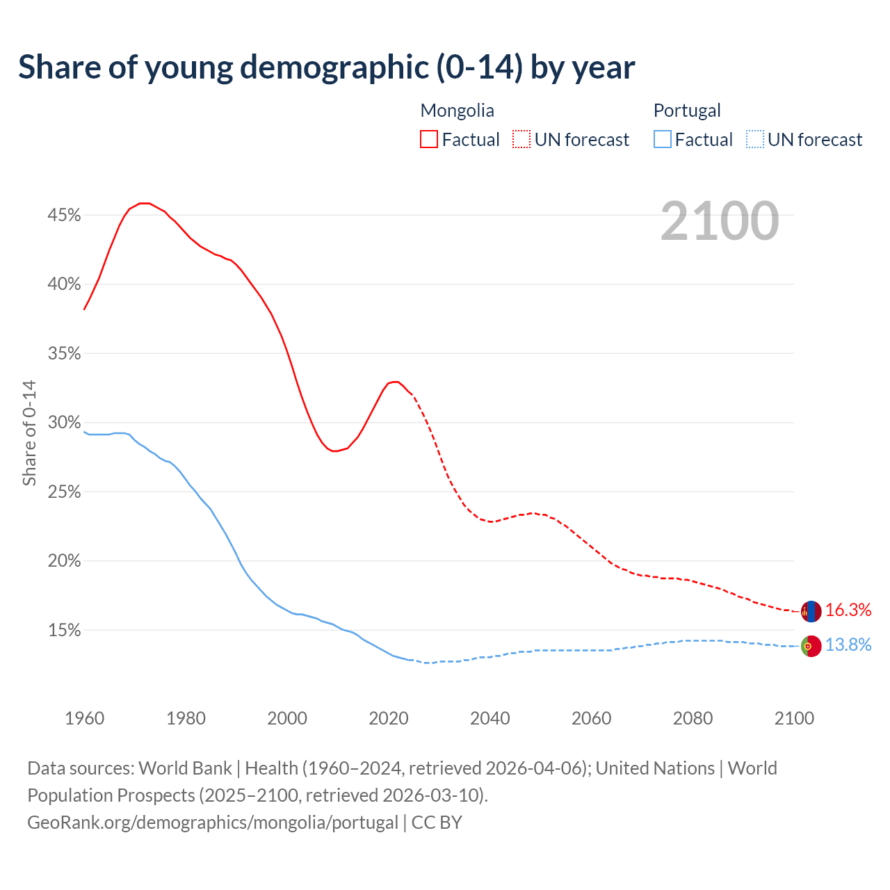 - The share of young demographic (0-15 years old) in Mongolia is 32.2% vs 12.8% in Portugal.