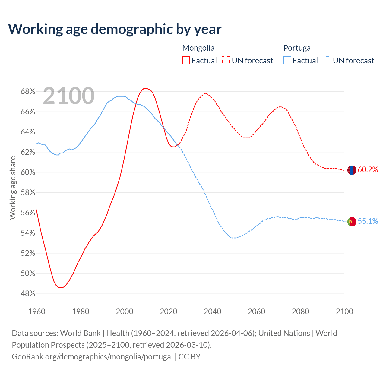 Median age Mongolia vs Portugal, 1960-2100