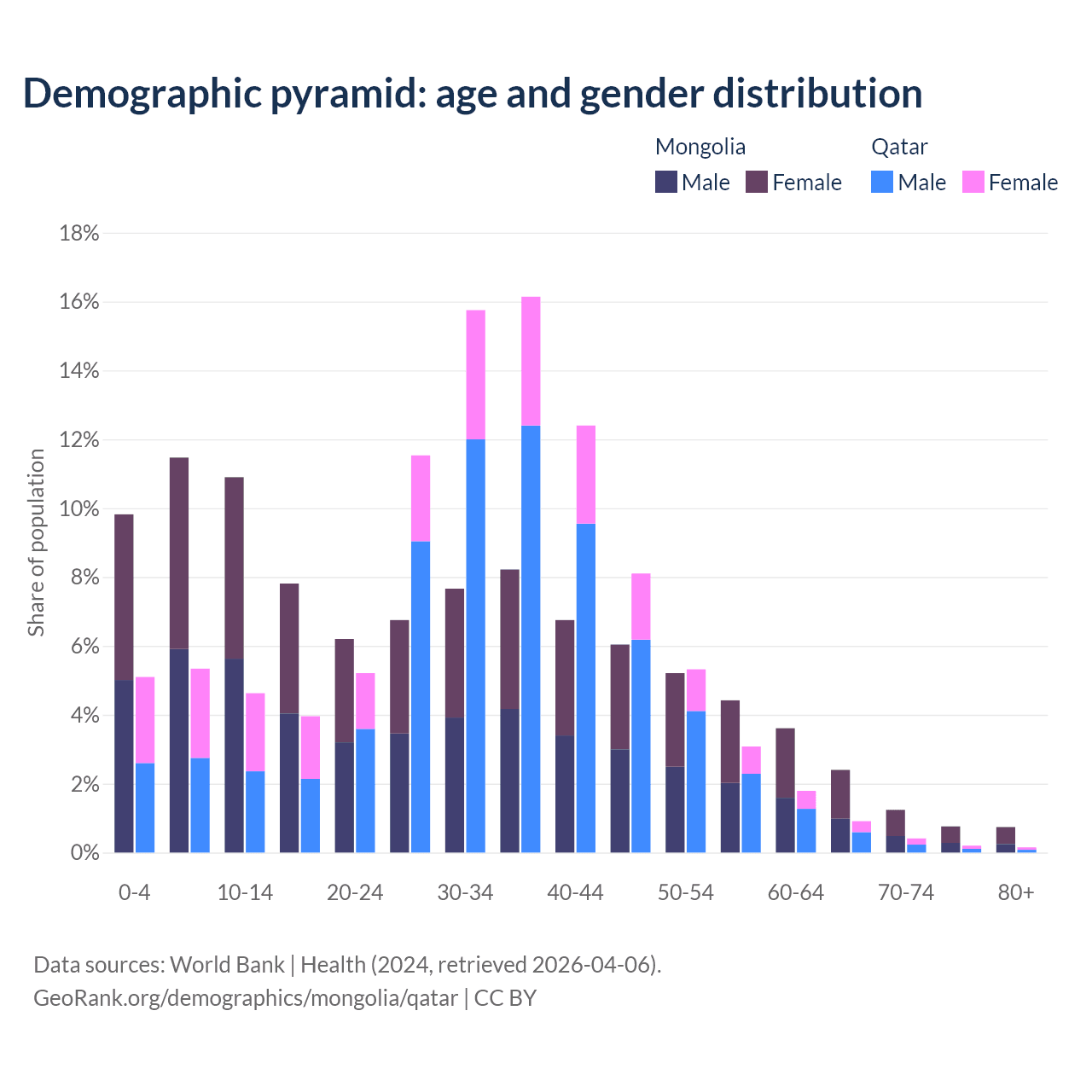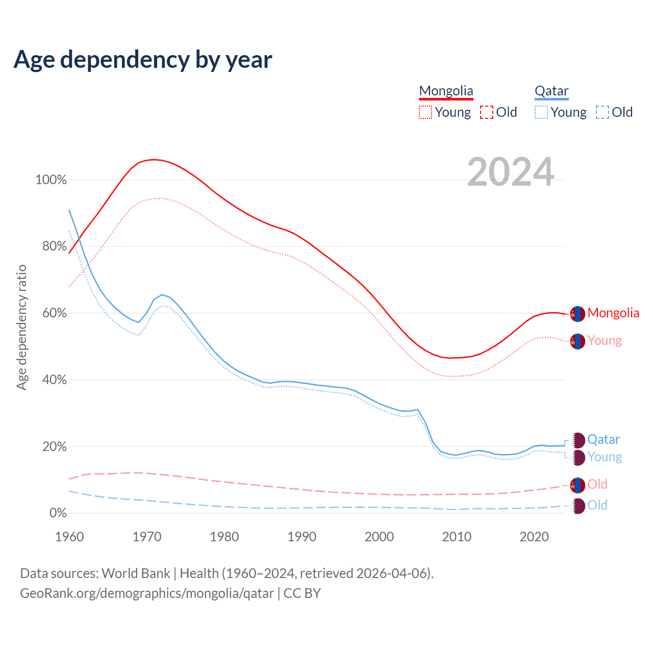 - Mongolia is ranked 117/196 by median age (oldest to youngest) vs 78/196 for Qatar.