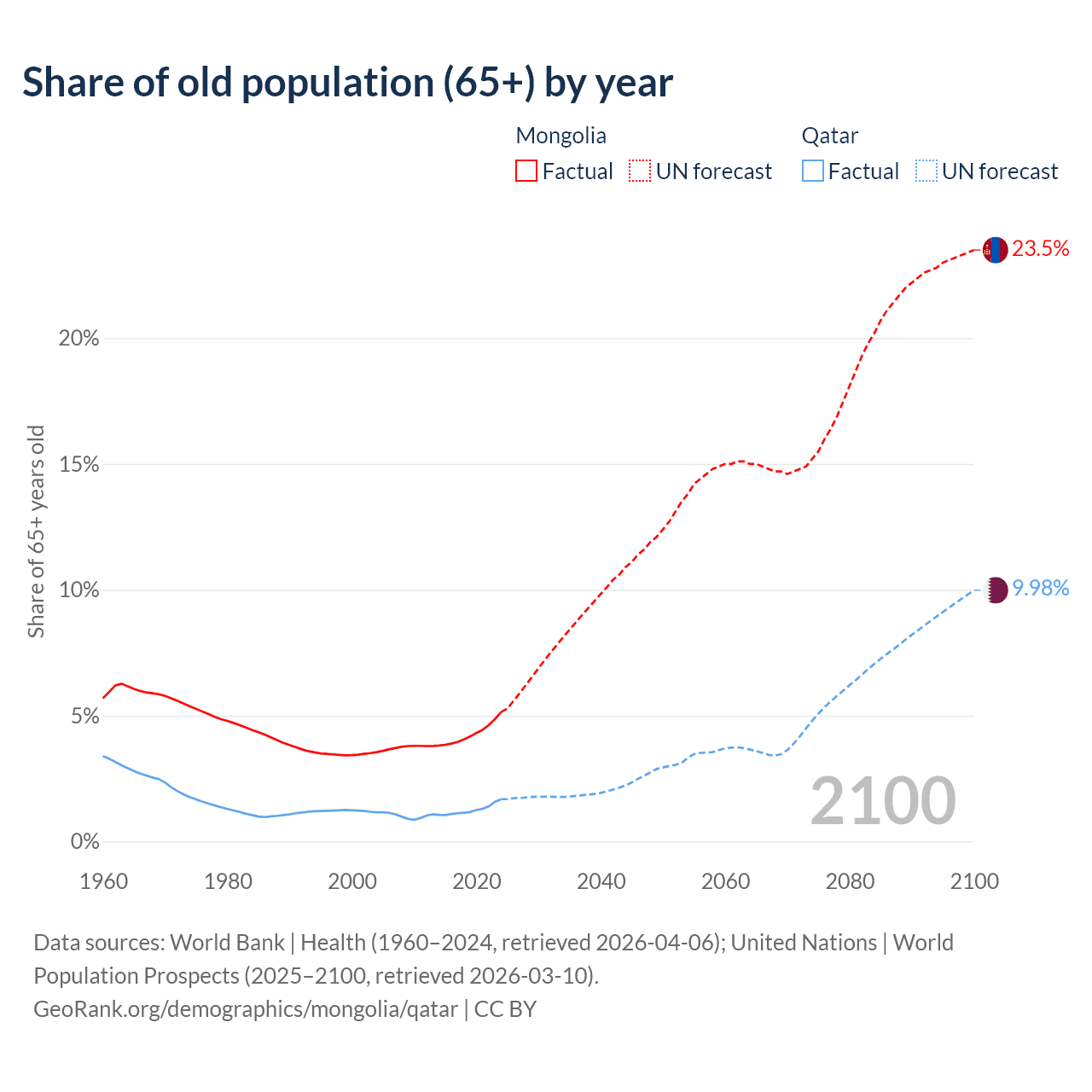 The share of older people aged 65 and over is 5.14% in Mongolia and 1.68% in Qatar. Life expectancy in Mongolia compared to Qatar .