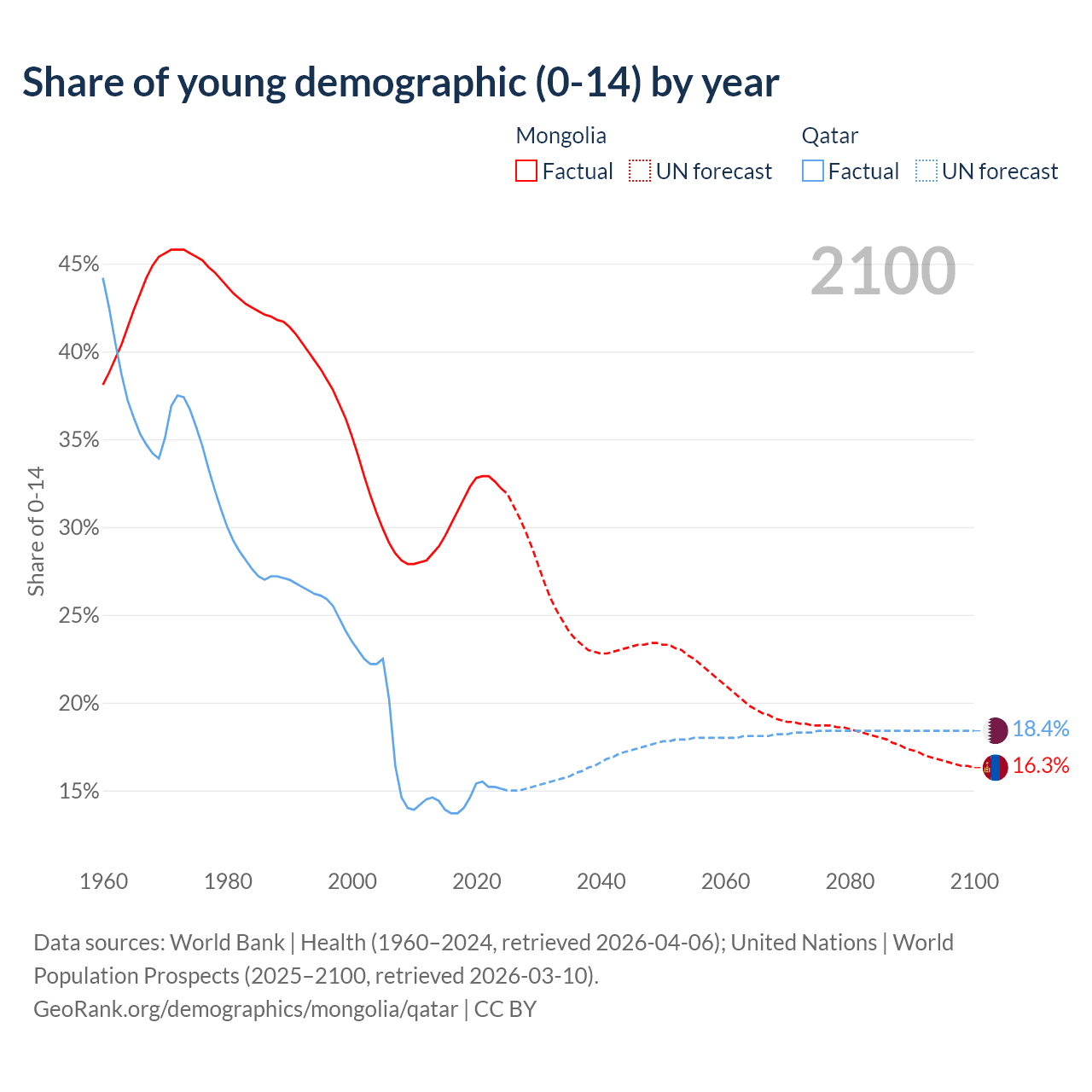- The share of young demographic (0-15 years old) in Mongolia is 32.2% vs 15.1% in Qatar.