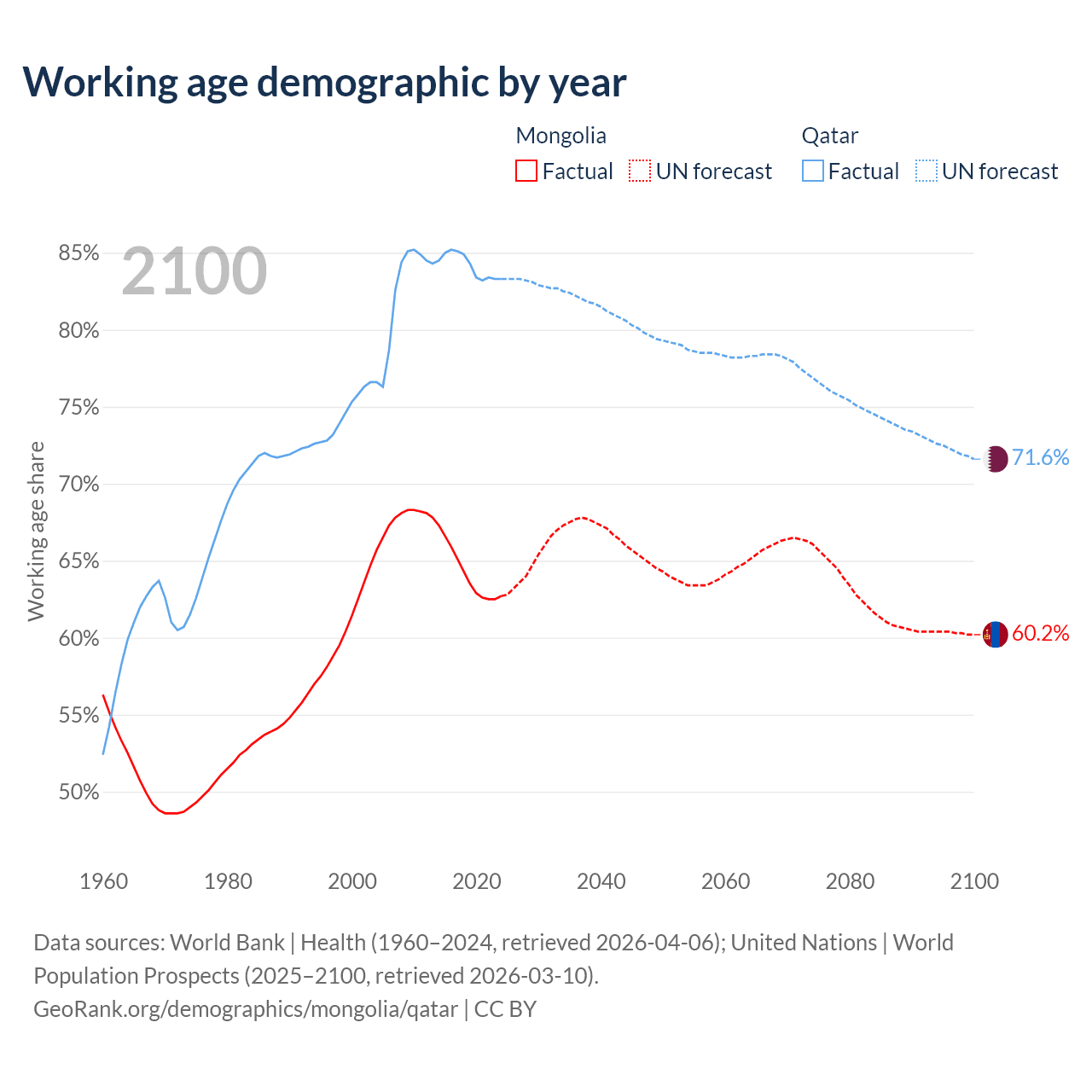 - Mongolia has 2.27M working age adults (aged 15-64) vs 2.5M in Qatar.