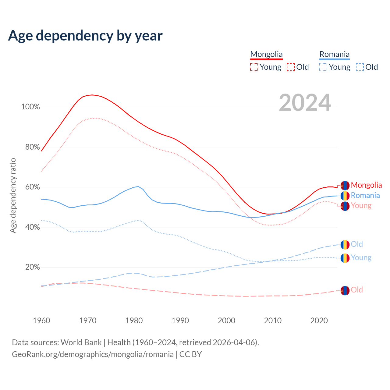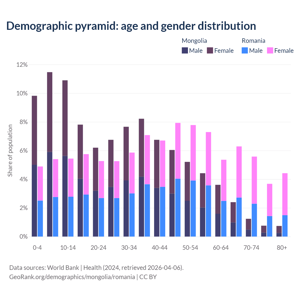 - Mongolia is ranked 117/196 by median age (oldest to youngest) vs 23/196 for Romania.
