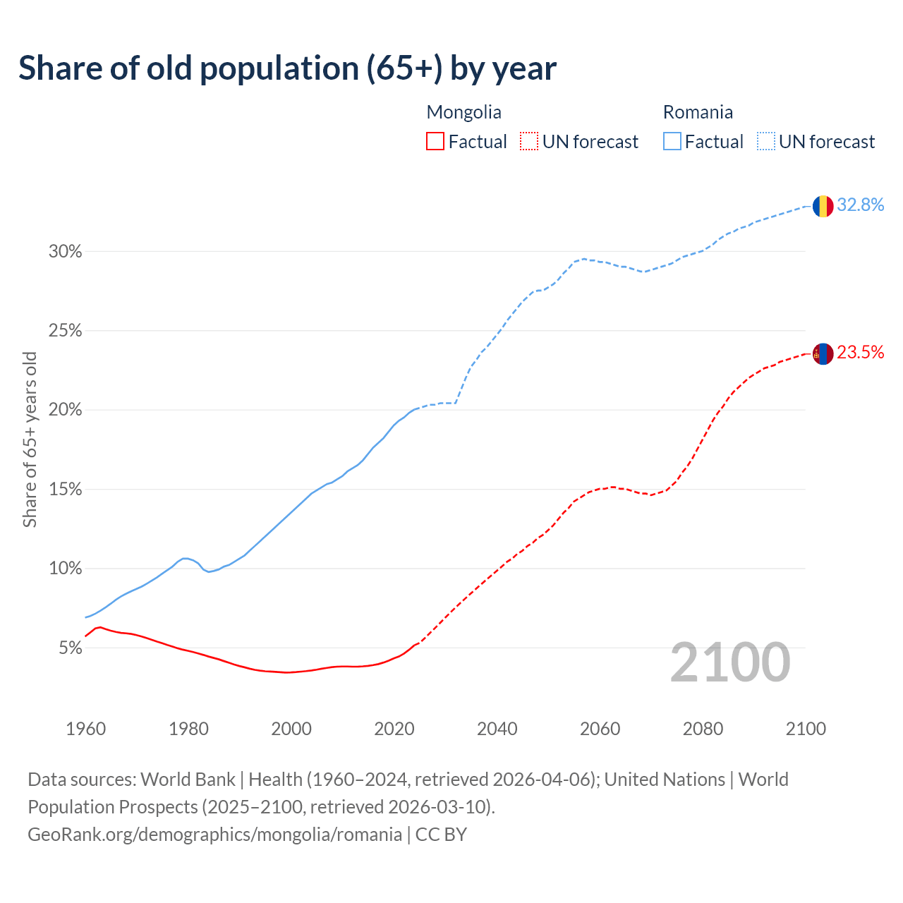 The share of older people aged 65 and over is 5.14% in Mongolia and 20% in Romania. Life expectancy in Mongolia compared to Romania .