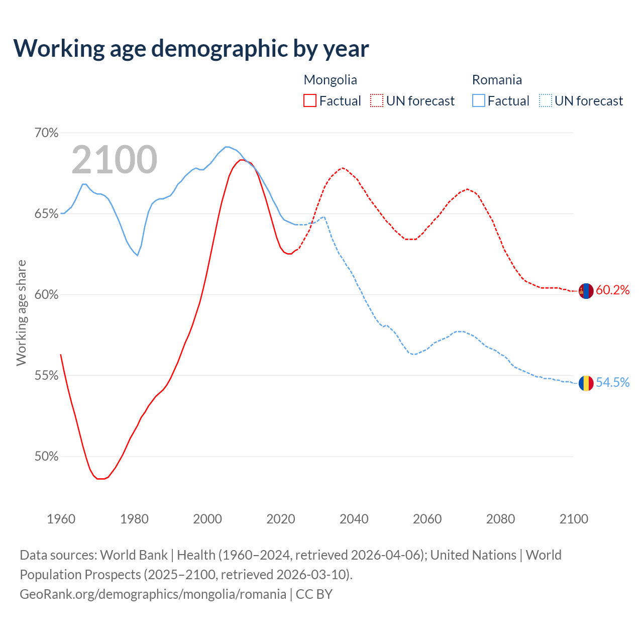 - Mongolia has 2.27M working age adults (aged 15-64) vs 12.1M in Romania.