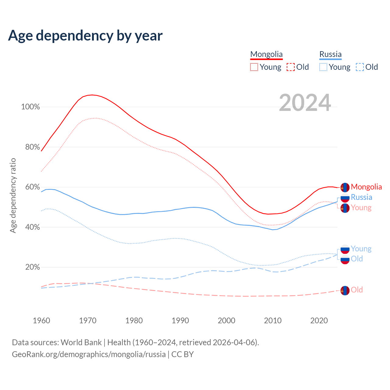 - Mongolia is ranked 117/196 by median age (oldest to youngest) vs 42/196 for Russia.