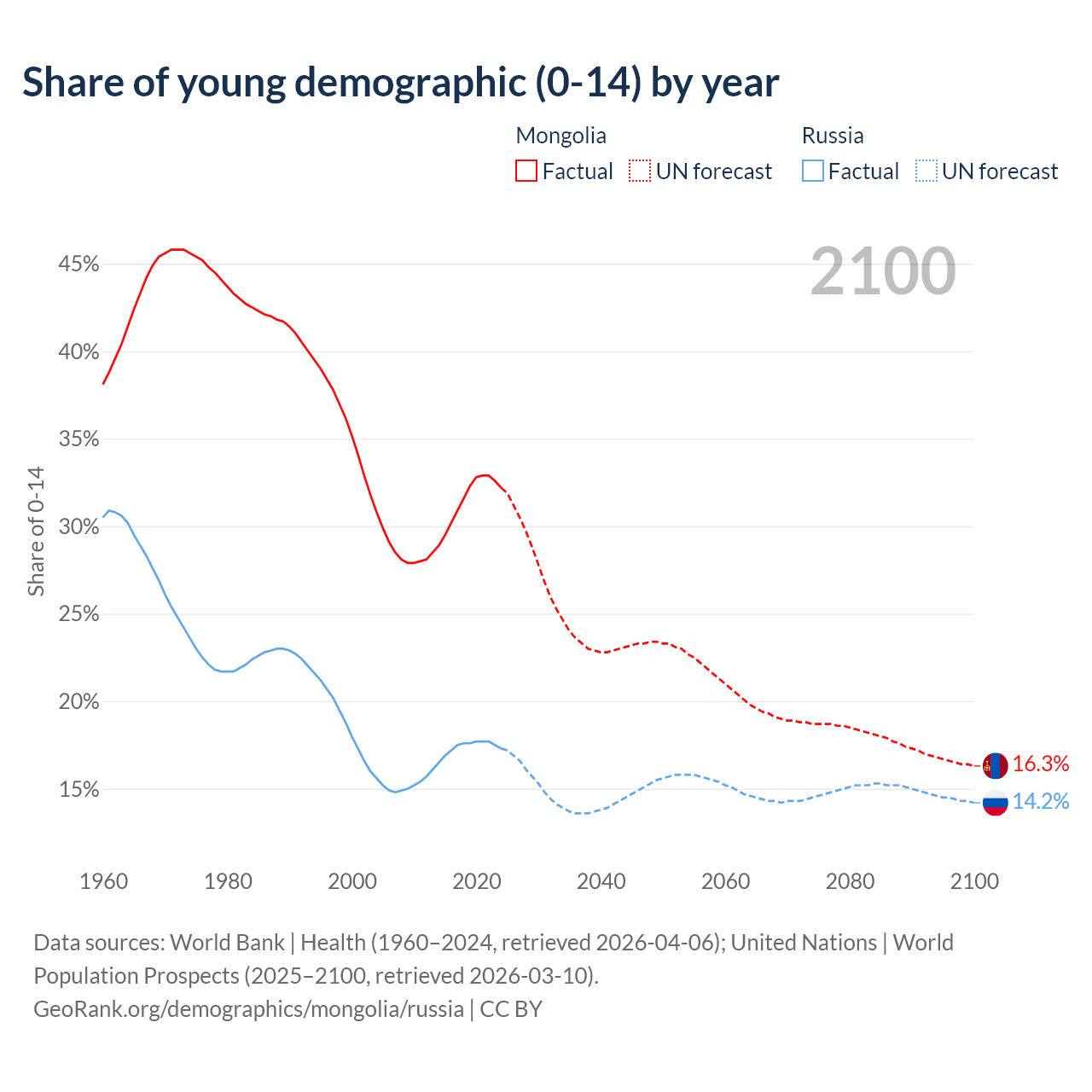 - The share of young demographic (0-15 years old) in Mongolia is 32.2% vs 17.3% in Russia.