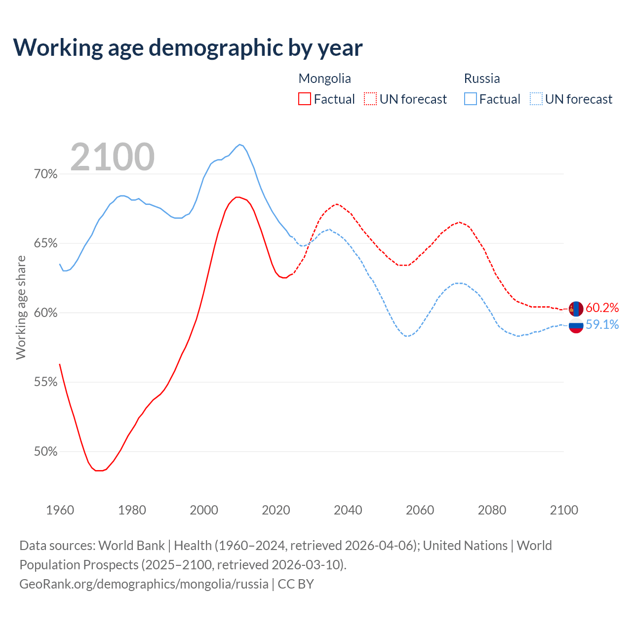 The share of older people aged 65 and over is 5.14% in Mongolia and 17.2% in Russia. Life expectancy in Mongolia compared to Russia .