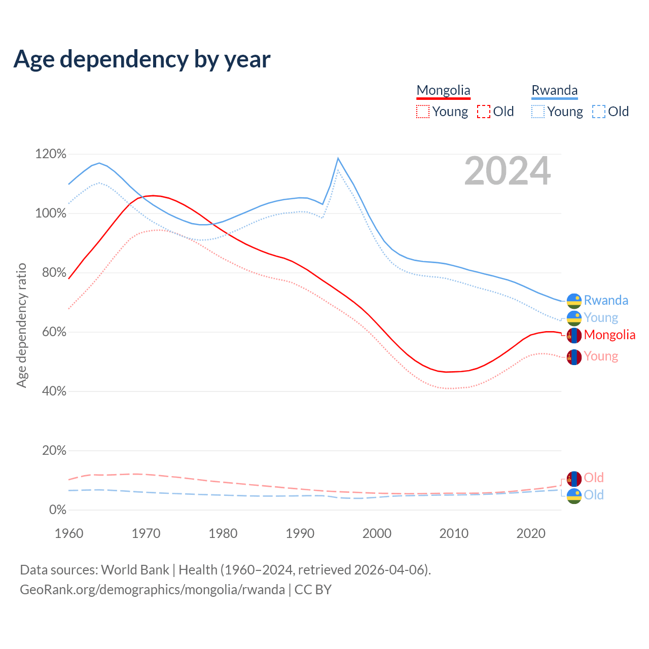 - The share of old-age demographic (65+) in Mongolia is 5.14% vs 3.93% in Rwanda.